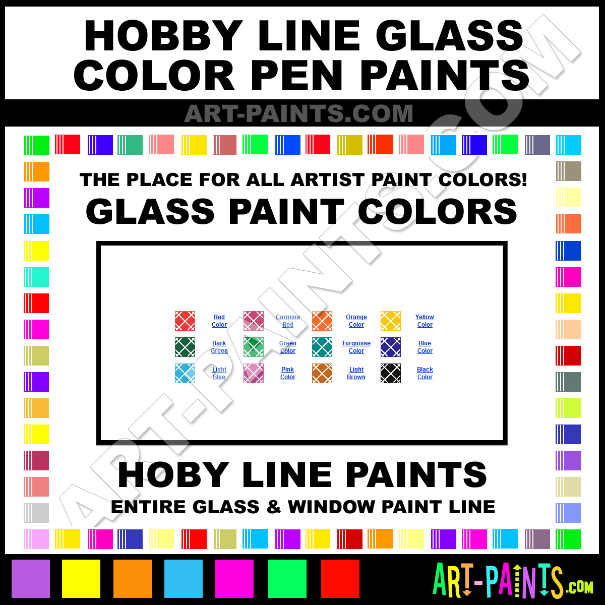 Hobby Line knows Glass and Window Paints! They make a wonderful brand of Paints, Stains or Inks called Hobby Line Glass Color Pen Glass Paint Colors that suits all types of Artists especially Stained Glass Artists. They strive to perfect the process of color and are one of the most popular Glass and Window Paint Brand companies in the world. Enjoy their entire paint brand collection from the list below. Hobby Line makes wonderful Artists Paints that everyone is sure to enjoy! Choose a Paint below to view that Hue or Color.     -Art-Paints.com