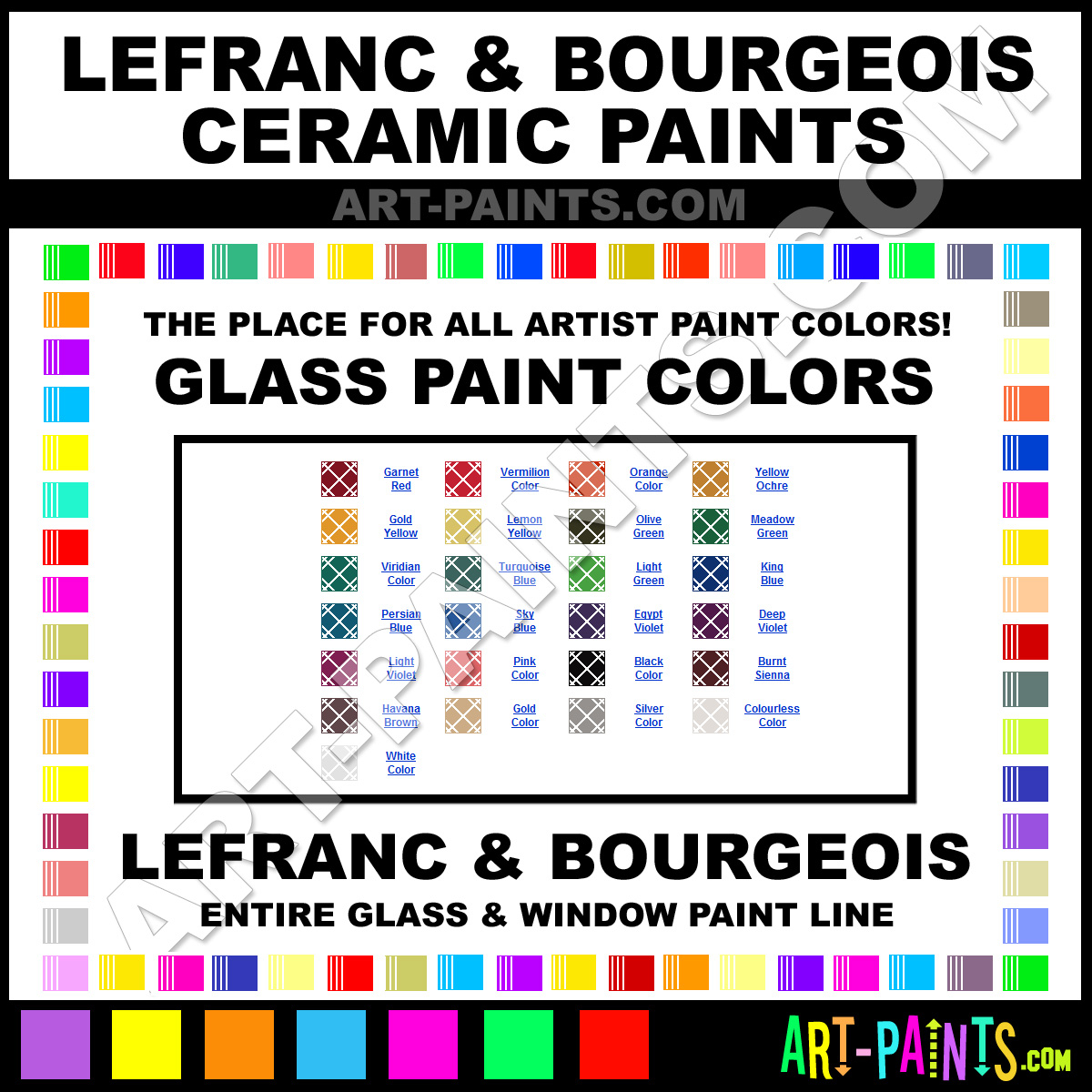 Lefranc and Bourgeois knows Glass and Window Paints! They make a wonderful brand of Paints, Stains or Inks called Lefranc and Bourgeois CeramiC Glass Paint Colors that suits all types of Artists especially Stained Glass Artists. They strive to perfect the process of color and are one of the most popular Glass and Window Paint Brand companies in the world. Enjoy their entire paint brand collection from the list below. Lefranc and Bourgeois makes wonderful Paints that everyone will enjoy! Choose a Paint to view that Color.     -Art-Paints.com