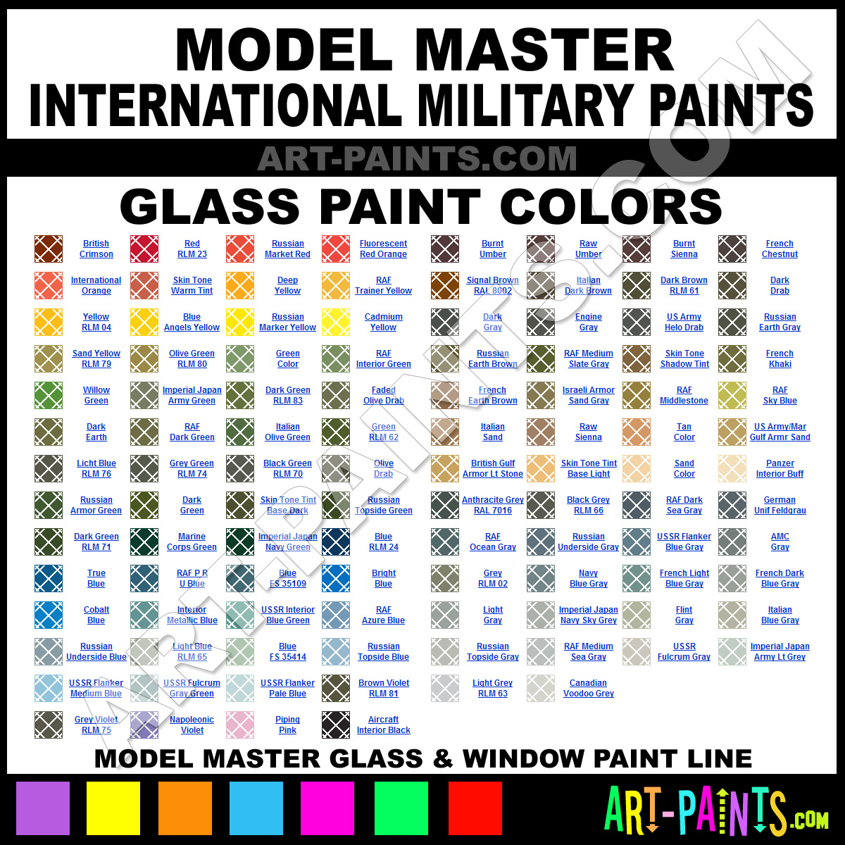 Model Master knows Glass and Window Paints! They make a wonderful brand of Paints, Stains or Inks called Model Master International Military Glass Paint Colors that suits all types of Artists especially Stained Glass Artists. They strive to perfect the process of color and are one of the most popular Glass and Window Paint Brand companies in the world. Enjoy their entire paint brand collection from the list below. Model Master makes wonderful Artists Paints that everyone is sure to enjoy! Choose a Paint below to view that Hue or Color.     -Art-Paints.com