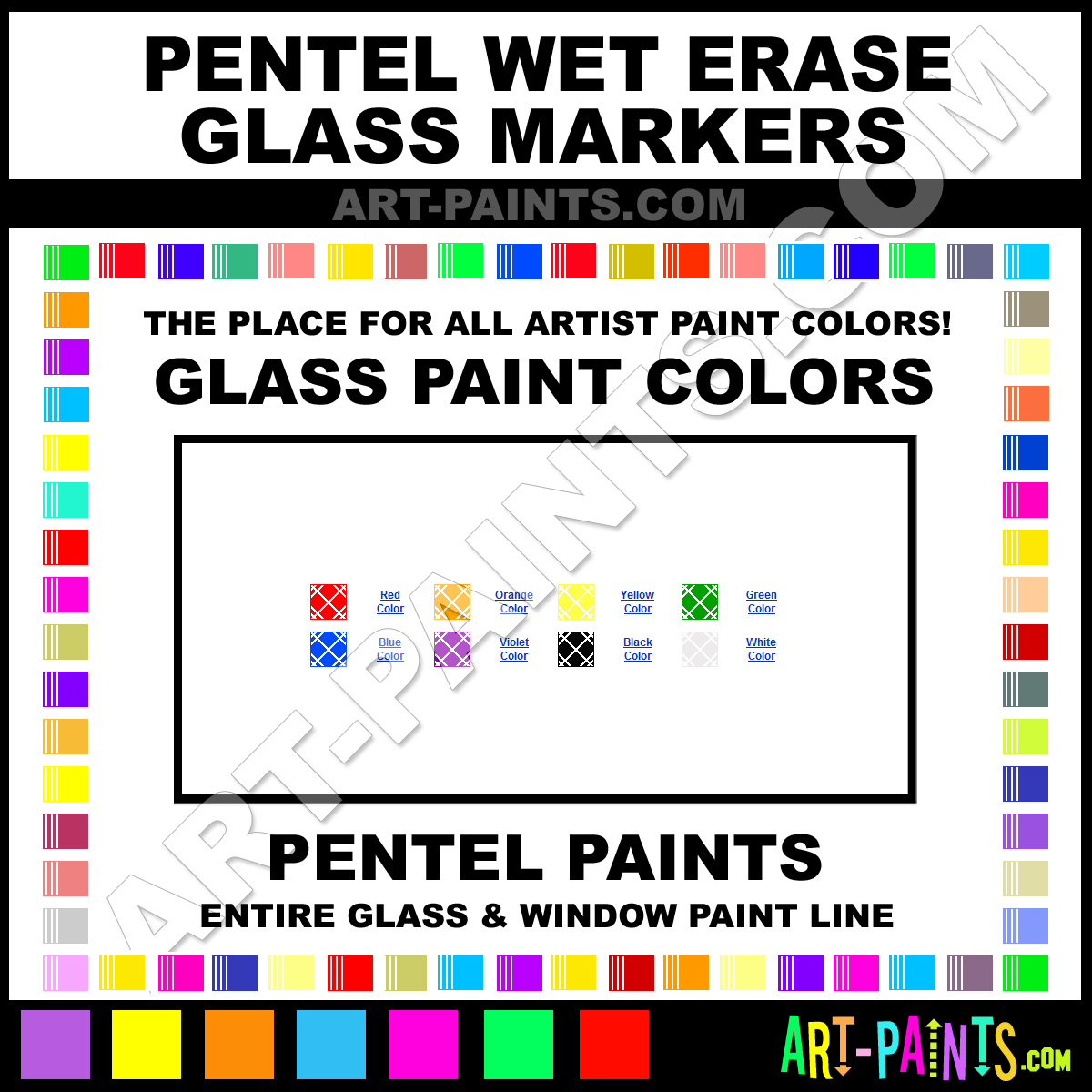 Pentel knows Glass Window Paints! They make a wonderful brand of paint, stains and inks called Pentel Wet Erase Markers Glass Colors that suits all types of artists. They strive to perfect the process of color and are one of the most popular Glass Paint Brand companies in the world. Enjoy their entire paint brand collection from the list below. Pentel makes wonderful Paints that everyone is sure to enjoy, especially Stained Glass Artists! Choose a Glass Paint below to view that Hue, Tone and all their wonderful Colors.     -Art-Paints.com