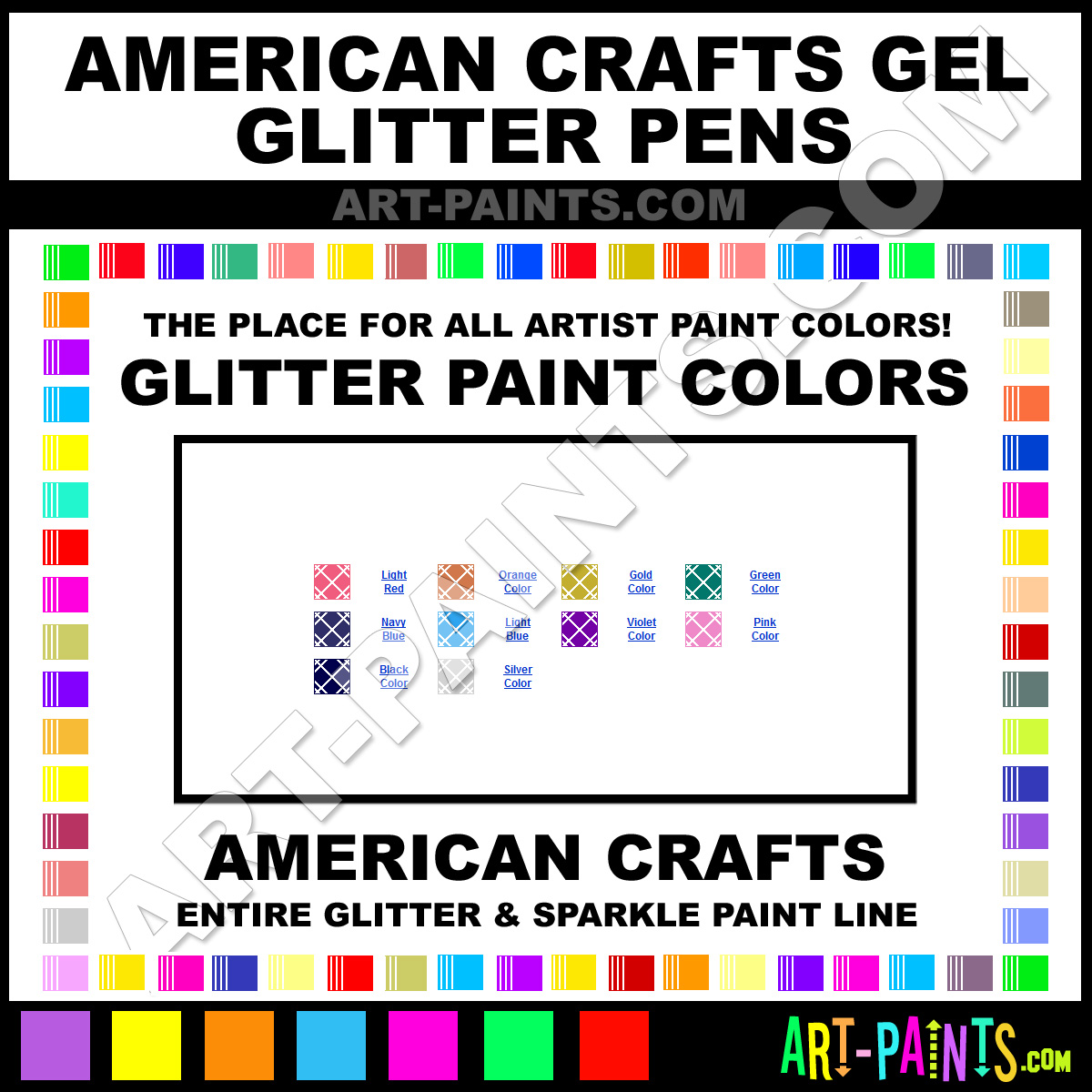 American Crafts knows Glitter Paints, whether it be for Metallics, Shimmers, Pearlescents or Iridescents! They make a wonderful brand of Paint called American Crafts Gel Glitter Pens Glitter Colors that suits all types of Artists. They strive to perfect the process of color and are one of the most popular Glitter Paint companies in the world. Enjoy their entire paint brand collection from the list below. American Crafts makes wonderful Artists Paints that everyone is sure to enjoy! Choose a Glitter Paint below to view that Hue or Color.     -Art-Paints.com