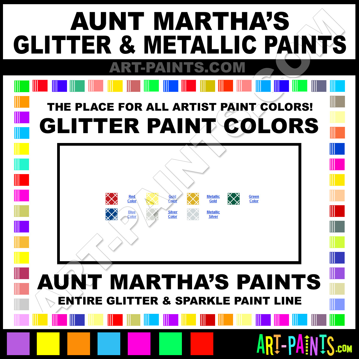 Aunt Marthas knows Glitter Paints, whether it be for Metallics, Shimmers, Pearlescents or Iridescents! They make a wonderful brand of Paint called Aunt Marthas Glitter and Metallic Glitter Colors that suits all types of Artists. They strive to perfect the process of color and are one of the most popular Glitter Paint companies in the world. Enjoy their entire paint brand collection from the list below. Aunt Marthas makes wonderful Artists Paints that everyone is sure to enjoy! Choose a Glitter Paint below to view that Hue or Color.     -Art-Paints.com