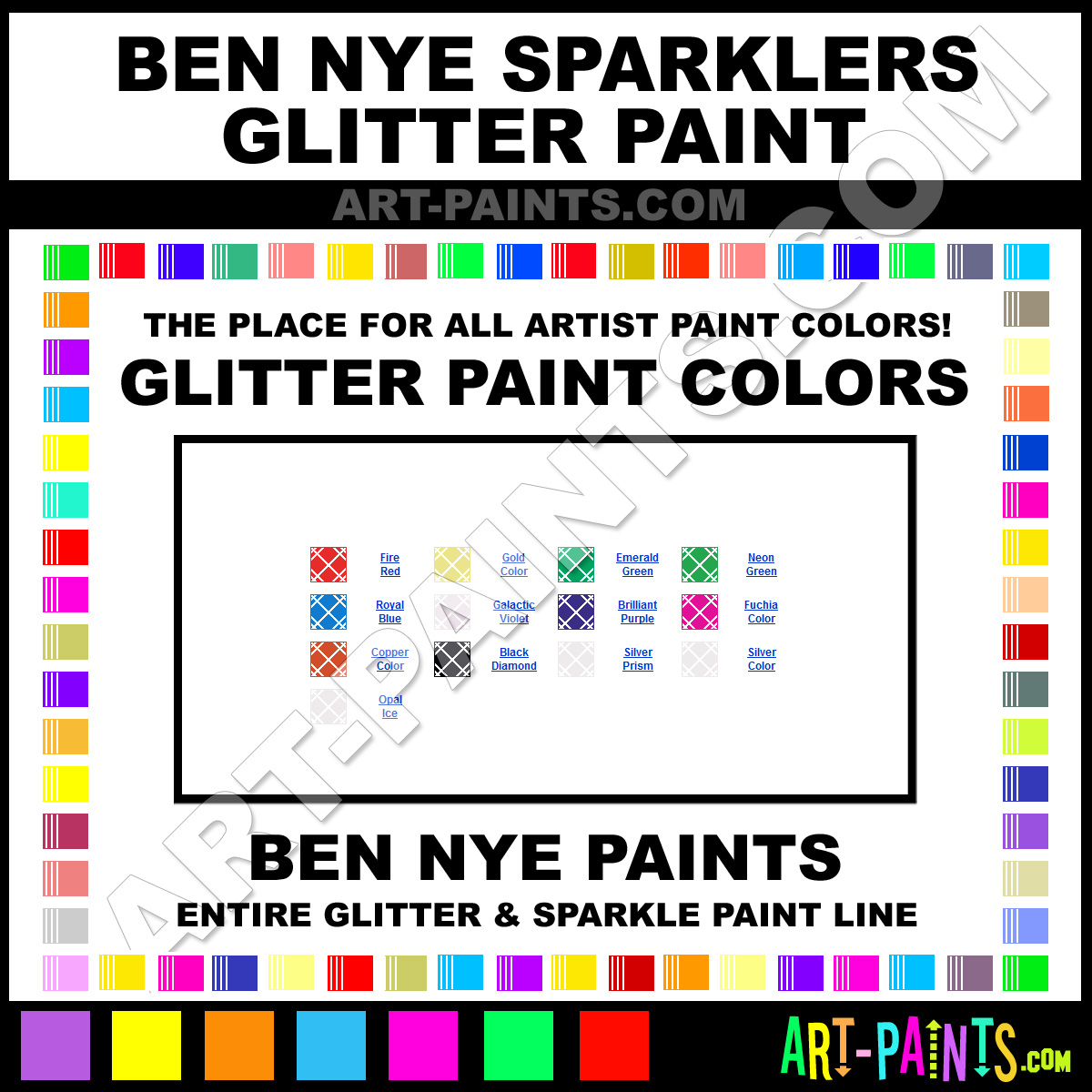Ben Nye knows Glitter Paints, whether it be for Metallics, Shimmers, Pearlescents or Iridescents! They make a wonderful brand of Paint called Ben Nye Sparklers Glitter Colors that suits all types of Artists. They strive to perfect the process of color and are one of the most popular Glitter Paint companies in the world. Enjoy their entire paint brand collection from the list below. Ben Nye makes wonderful Artists Paints that everyone is sure to enjoy! Choose a Glitter Paint below to view that Hue or Color.     -Art-Paints.com