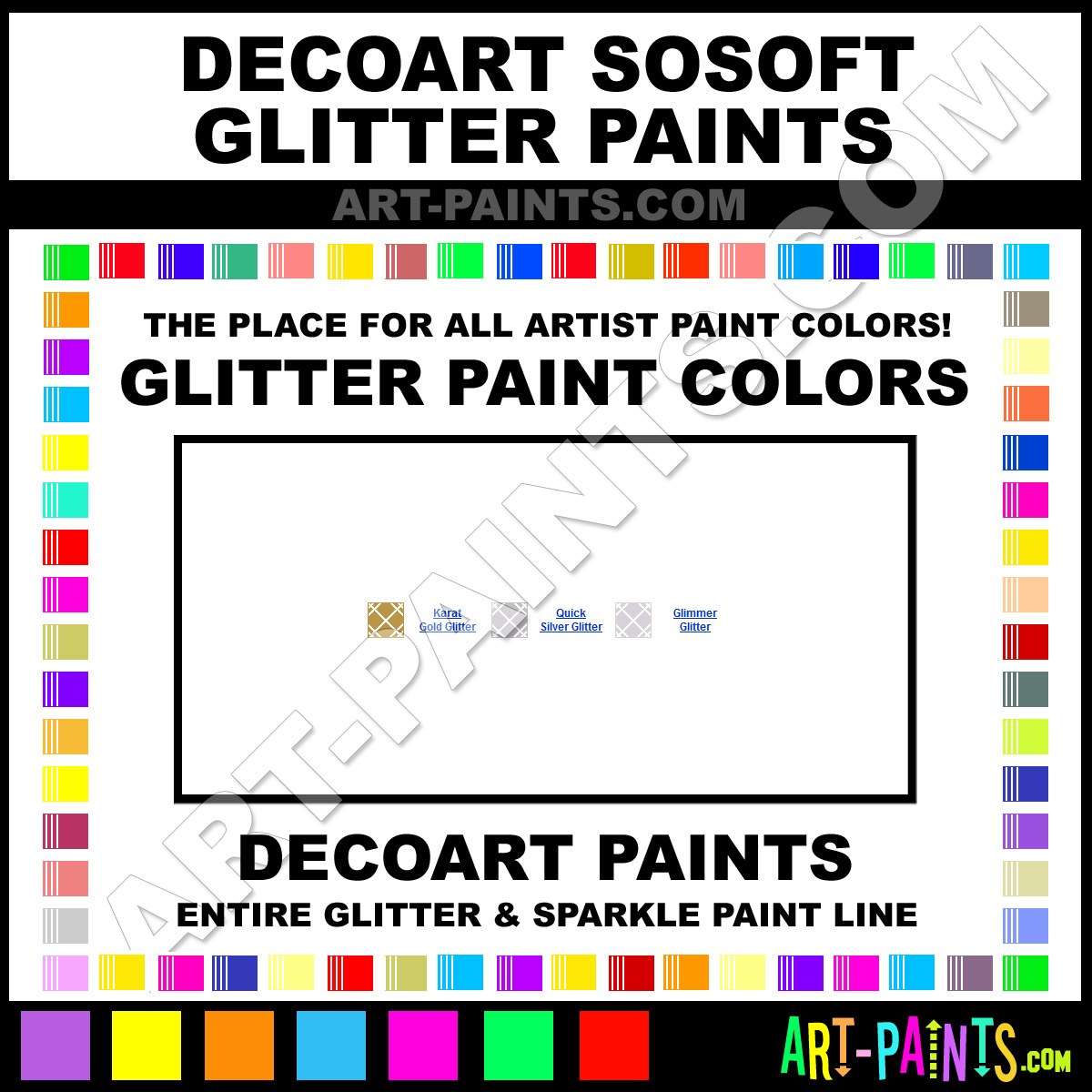 DecoArt knows Glitter Paints, whether it be for Metallics, Shimmers, Pearlescents or Iridescents! They make a wonderful brand of Paint called DecoArt SoSoft Glitters Glitter Colors that suits all types of Artists. They strive to perfect the process of color and are one of the most popular Glitter Paint companies in the world. Enjoy their entire paint brand collection from the list below. DecoArt makes wonderful Artists Paints that everyone is sure to enjoy! Choose a Glitter Paint below to view that Hue or Color.     -Art-Paints.com