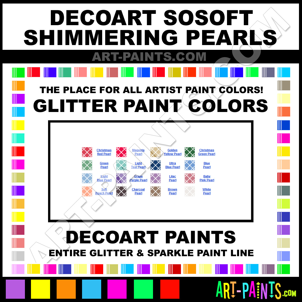 DecoArt knows Glitter Paints, whether it be for Metallics, Shimmers, Pearlescents or Iridescents! They make a wonderful brand of Paint called DecoArt SoSoft Shimmering Pearls Glitter Colors that suits all types of Artists. They strive to perfect the process of color and are one of the most popular Glitter Paint companies in the world. Enjoy their entire paint brand collection from the list below. DecoArt makes wonderful Artists Paints that everyone is sure to enjoy! Choose a Glitter Paint below to view that Hue or Color.     -Art-Paints.com
