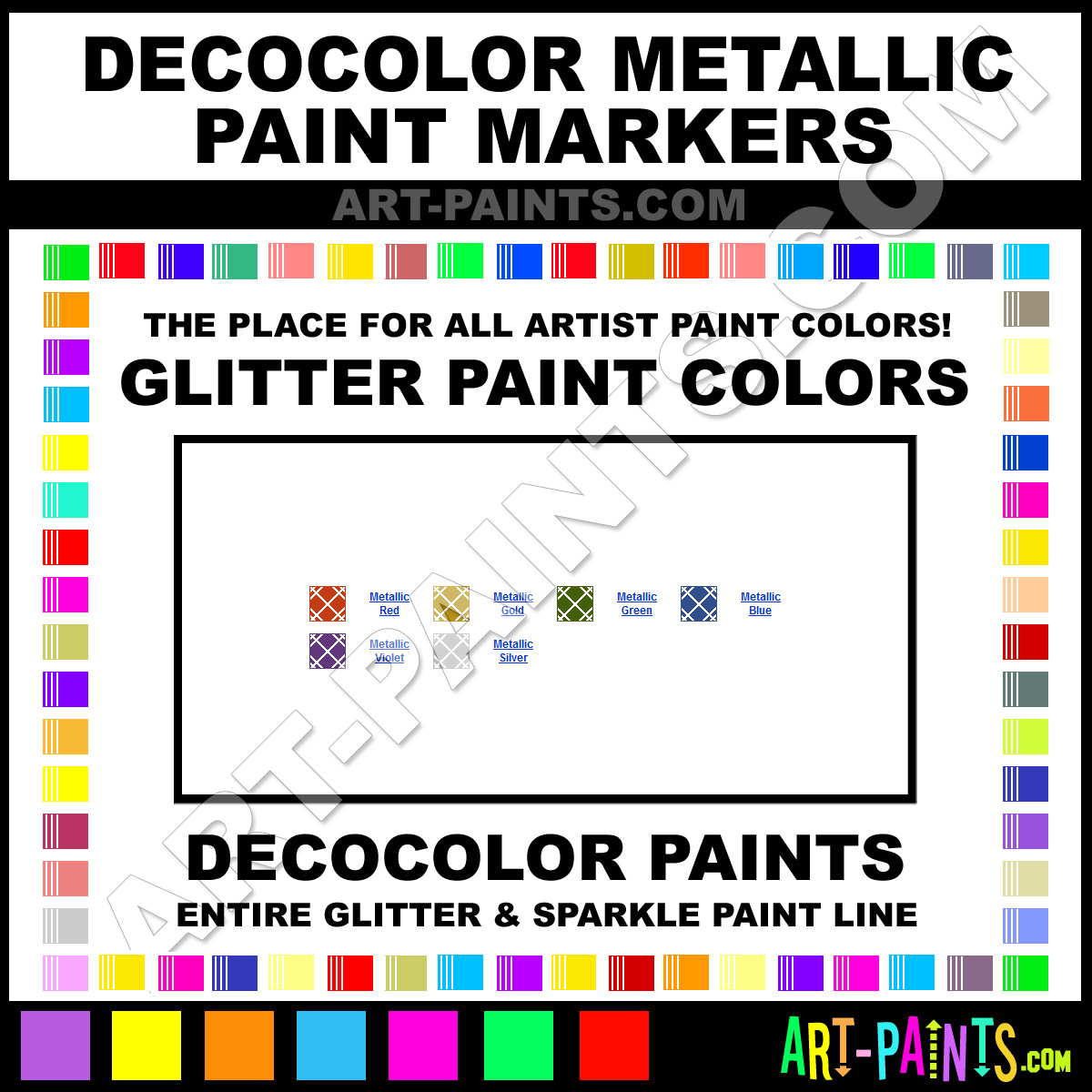DecoColor knows Glitter Paints, whether it be for Metallics, Shimmers, Pearlescents or Iridescents! They make a wonderful brand of Paint called DecoColor Metallic Paint Marker Glitter Colors that suits all types of Artists. They strive to perfect the process of color and are one of the most popular Glitter Paint companies in the world. Enjoy their entire paint brand collection from the list below. DecoColor makes wonderful Artists Paints that everyone is sure to enjoy! Choose a Glitter Paint below to view that Hue or Color.     -Art-Paints.com