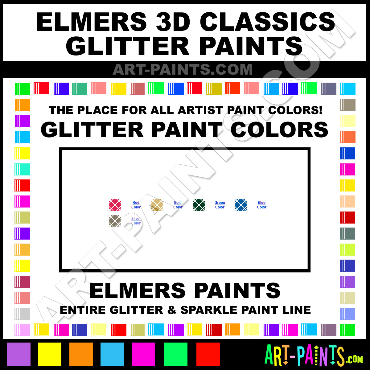 Elmers knows Glitter Paints, whether it be for Metallics, Shimmers, Pearlescents or Iridescents! They make a wonderful brand of Paint called Elmers 3D Classics Glitter Colors that suits all types of Artists. They strive to perfect the process of color and are one of the most popular Glitter Paint companies in the world. Enjoy their entire paint brand collection from the list below. Elmers makes wonderful Artists Paints that everyone is sure to enjoy! Choose a Glitter Paint below to view that Hue or Color.     -Art-Paints.com