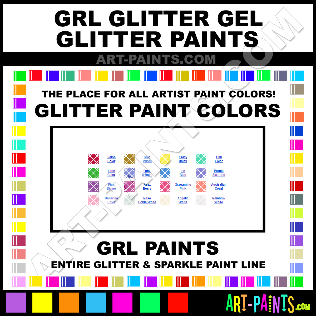 GRL knows Glitter Paints, whether it be for Metallics, Shimmers, Pearlescents or Iridescents! They make a wonderful brand of Paint called GRL Glitter Gel Glitter Colors that suits all types of Artists. They strive to perfect the process of color and are one of the most popular Glitter Paint companies in the world. Enjoy their entire paint brand collection from the list below. GRL makes wonderful Artists Paints that everyone is sure to enjoy! Choose a Glitter Paint below to view that Hue or Color.     -Art-Paints.com