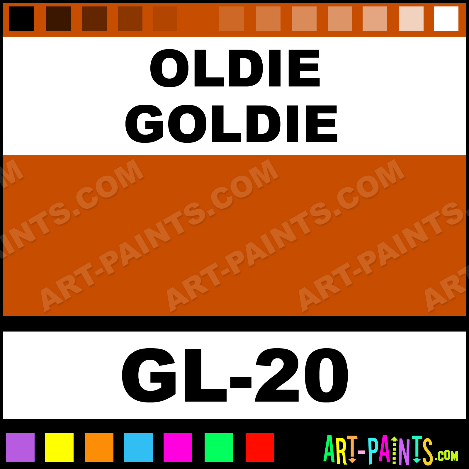 This beautiful Shimmer Glitter Glitter Sparkle shade is called Oldie Goldie, and comes from a company called GRL. Their product number, along with the HTML color code, RGB, and CMYK codes are listed below. This Beautiful Shade of Oldie Goldie and others can be found in the GRL Shimmer Glitter Art Paint Gallery, whether it's for Glitters, Metallics, Shimmers, Pearlescents or Iridescents, it's here! Also be sure to browse the other Professional Galleries to see more of GRL Shimmer Glitter Glitter Brand Paints!   -Art-Paints.com
