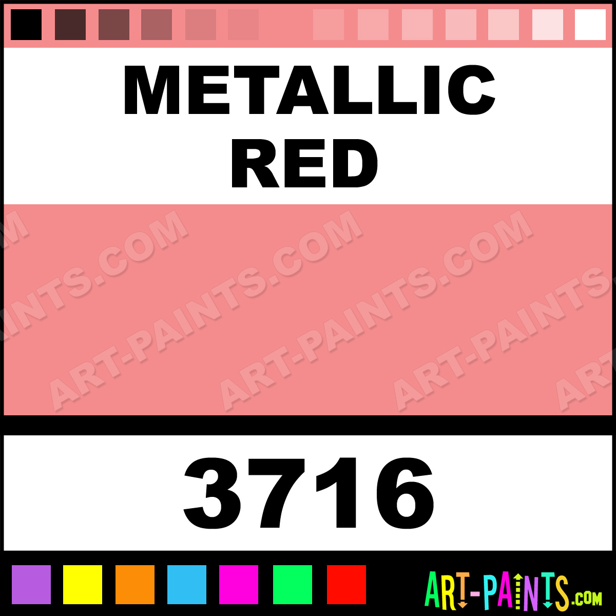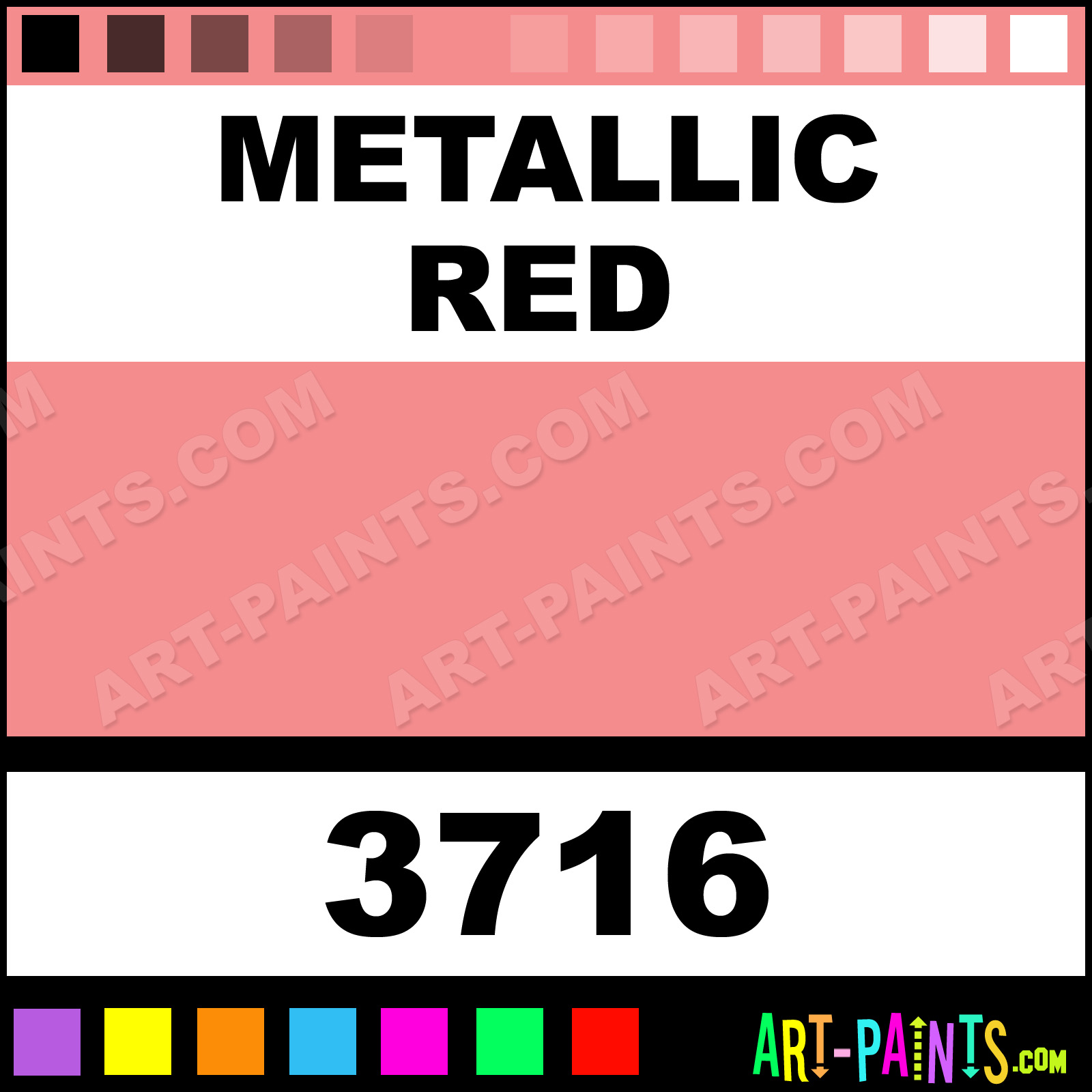This beautiful Ultra Activity Glitter Sparkle shade is called Metallic Red, and comes from a company called Prang. Their product number, along with the HTML color code, RGB, and CMYK codes are listed below. This Beautiful Shade of Metallic Red and others can be found in the Prang Ultra Activity Art Paint Gallery, whether it's for Glitters, Metallics, Shimmers, Pearlescents or Iridescents, it's here! Also be sure to browse the other Professional Galleries to see more of Prang Ultra Activity Glitter Brand Paints!   -Art-Paints.com