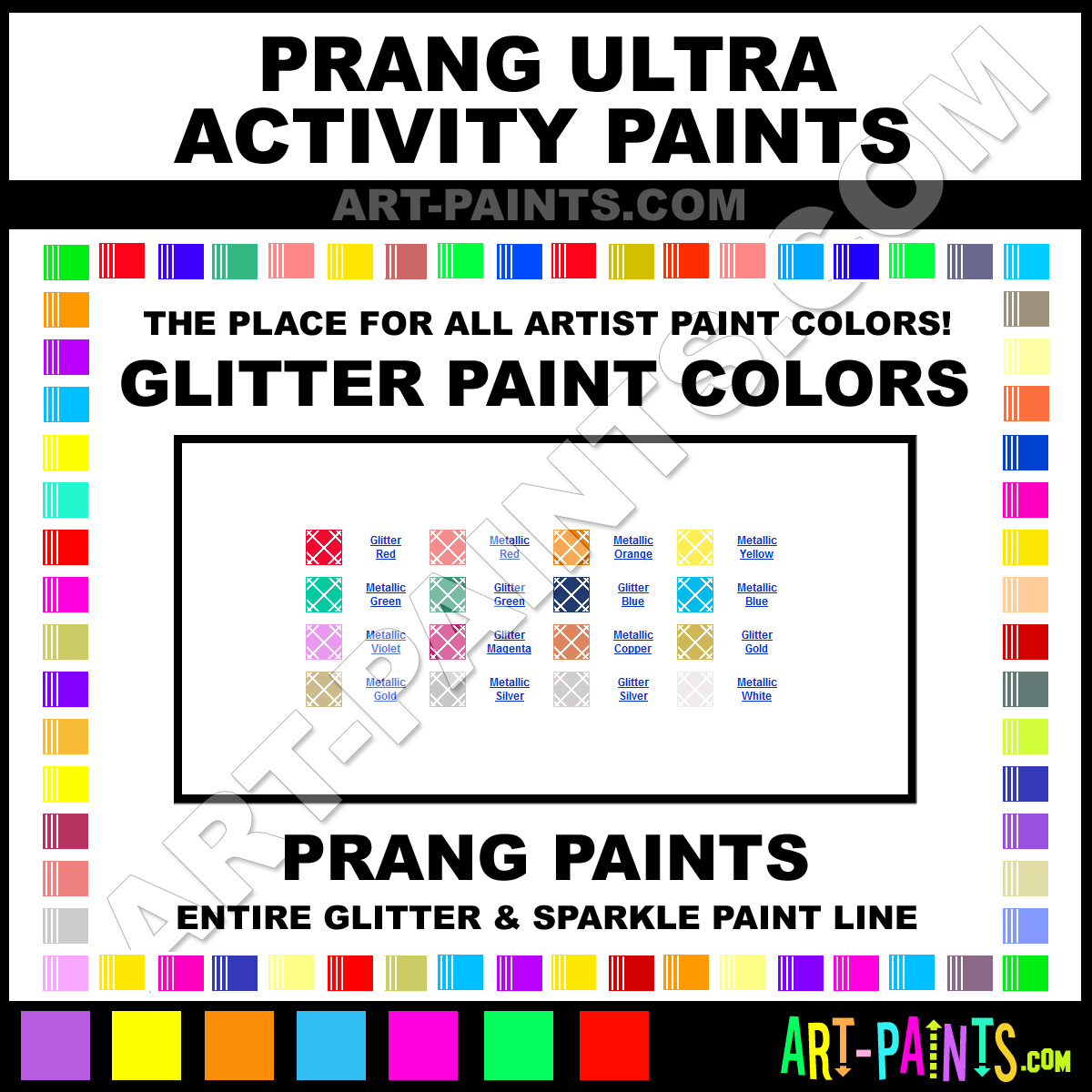 Prang knows Glitter Paints, whether it be for Metallics, Shimmers, Pearlescents or Iridescents! They make a wonderful brand of Paint called Prang Ultra Activity Glitter Colors that suits all types of Artists. They strive to perfect the process of color and are one of the most popular Glitter Paint companies in the world. Enjoy their entire paint brand collection from the list below. Prang makes wonderful Artists Paints that everyone is sure to enjoy! Choose a Glitter Paint below to view that Hue or Color.     -Art-Paints.com
