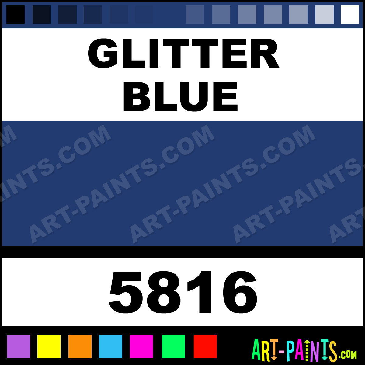 This beautiful Ultra Washable Tempera Glitter Sparkle shade is called Glitter Blue, and comes from a company called Prang. Their product number, along with the HTML color code, RGB, and CMYK codes are listed below. This Beautiful Shade of Glitter Blue and others can be found in the Prang Ultra Washable Tempera Art Paint Gallery, whether it's for Glitters, Metallics, Shimmers, Pearlescents or Iridescents, it's here! Also be sure to browse the other Professional Galleries to see more of Prang Ultra Washable Tempera Glitter Brand Paints!   -Art-Paints.com