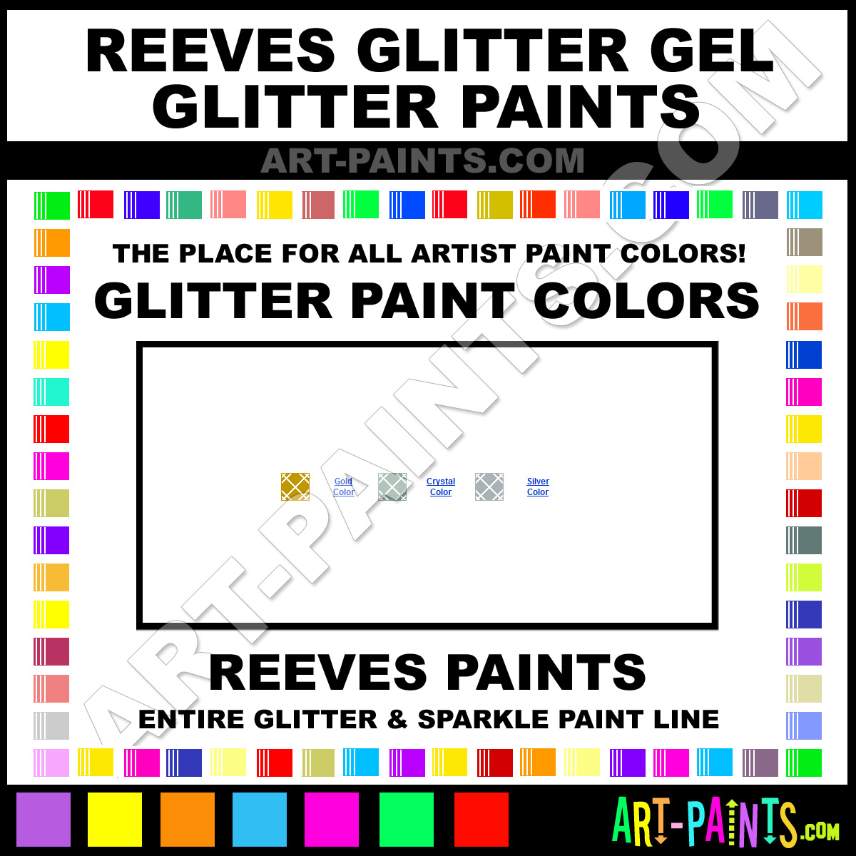 Reeves knows Glitter Paints, whether it be for Metallics, Shimmers, Pearlescents or Iridescents! They make a wonderful brand of Paint called Reeves Glitter Gel Glitter Colors that suits all types of Artists. They strive to perfect the process of color and are one of the most popular Glitter Paint companies in the world. Enjoy their entire paint brand collection from the list below. Reeves makes wonderful Artists Paints that everyone is sure to enjoy! Choose a Glitter Paint below to view that Hue or Color.     -Art-Paints.com