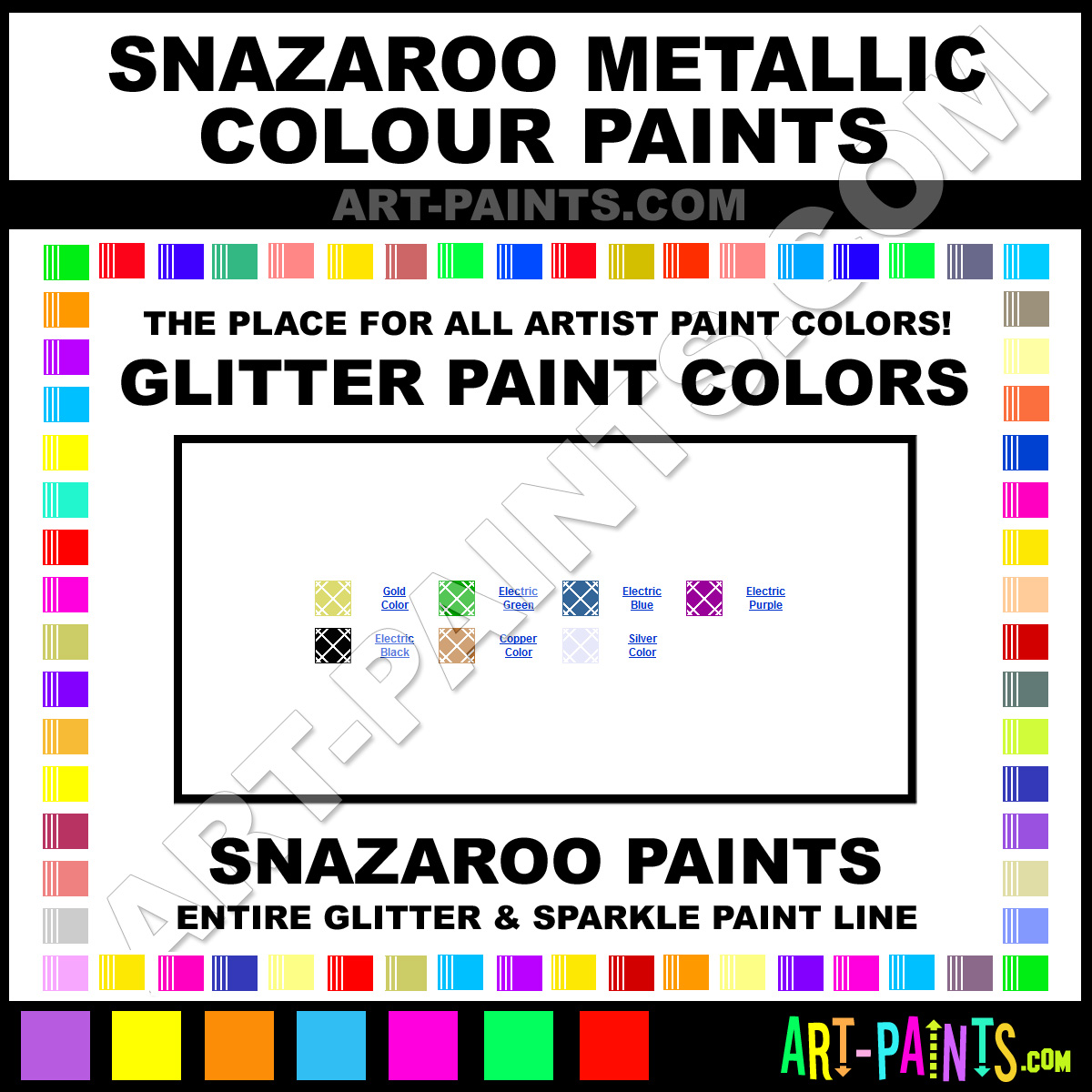 Snazaroo knows Glitter Paints, whether it be for Metallics, Shimmers, Pearlescents or Iridescents! They make a wonderful brand of Paint called Snazaroo Metallic Colours Glitter Colors that suits all types of Artists. They strive to perfect the process of color and are one of the most popular Glitter Paint companies in the world. Enjoy their entire paint brand collection from the list below. Snazaroo makes wonderful Artists Paints that everyone is sure to enjoy! Choose a Glitter Paint below to view that Hue or Color.     -Art-Paints.com