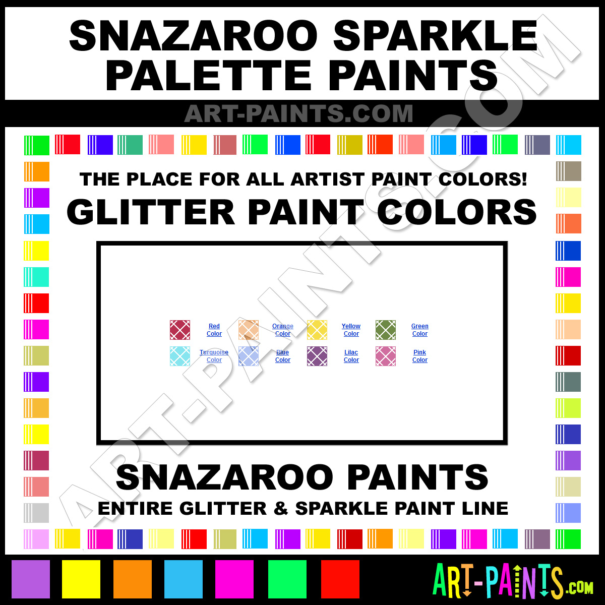Snazaroo knows Glitter Paints, whether it be for Metallics, Shimmers, Pearlescents or Iridescents! They make a wonderful brand of Paint called Snazaroo Sparkle Palette Glitter Colors that suits all types of Artists. They strive to perfect the process of color and are one of the most popular Glitter Paint companies in the world. Enjoy their entire paint brand collection from the list below. Snazaroo makes wonderful Artists Paints that everyone is sure to enjoy! Choose a Glitter Paint below to view that Hue or Color.     -Art-Paints.com
