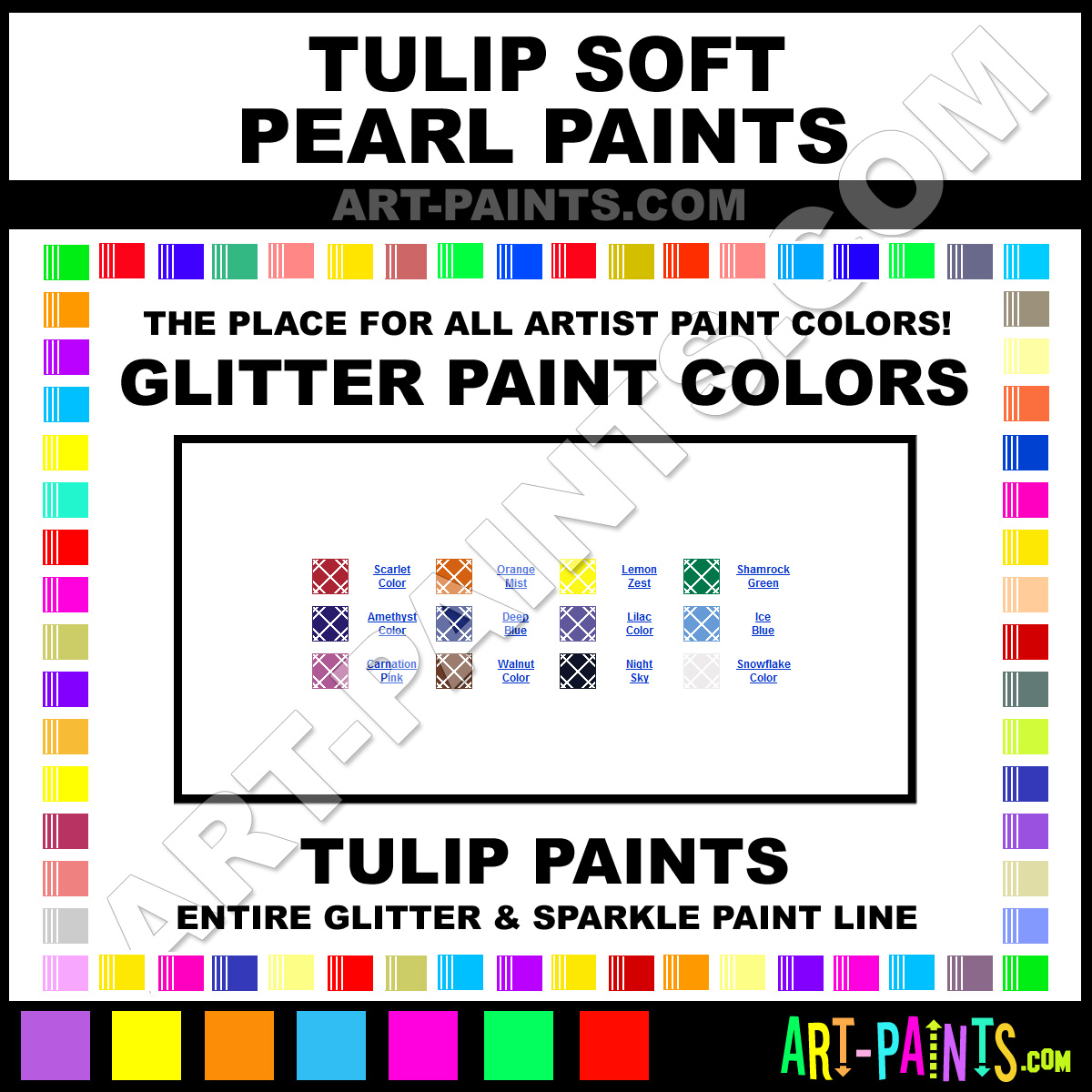Tulip makes a beautiful Soft Pearl Paint Brand. With a complete line of Glitter Paints, Shimmers, Iridescents or Pearlescents, 12 colors in all, available in beautiful hues and colors, they will no doubt keep you painting and smiling at the same time. This brand is very unique and exquisite!