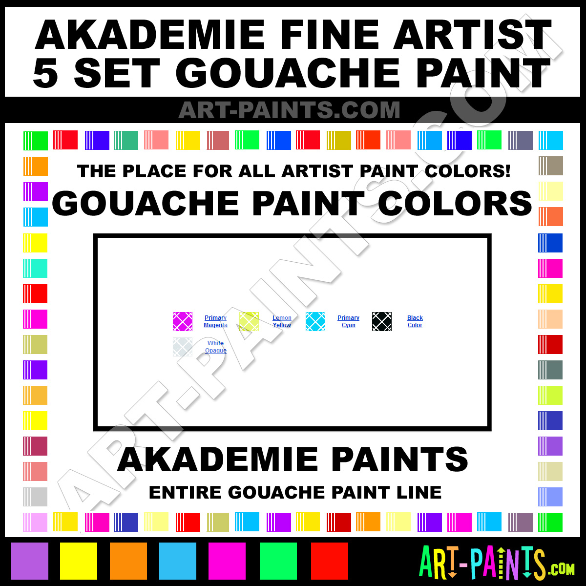 Akademie knows Gouache paints! They make a wonderful brand of paint called Akademie Fine Artist 5 Set Gouache Colors that suits all types of artists. They strive to perfect the process of color and are one of the most popular Gouache Paint Brand companies in the world. Enjoy their entire paint brand collection from the list below. Akademie makes wonderful Artists Paints that everyone is sure to enjoy! Choose an Gouache Paint Color below to view that Hue and all their great related color paints. Paint on!     -Art-Paints.com