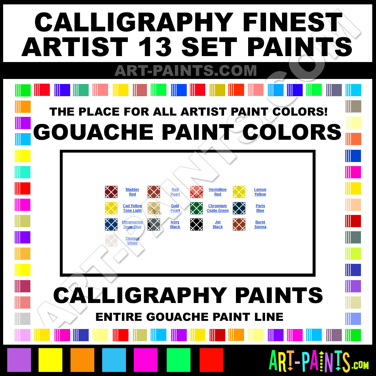 Calligraphy makes a beautiful Finest Artist 13 Set Paint Brand. With a complete line of Gouache Color Paints, 13 colors in all, available in beautiful hues and colors, they will no doubt keep you painting and smiling at the same time. This brand is very unique and exquisite!