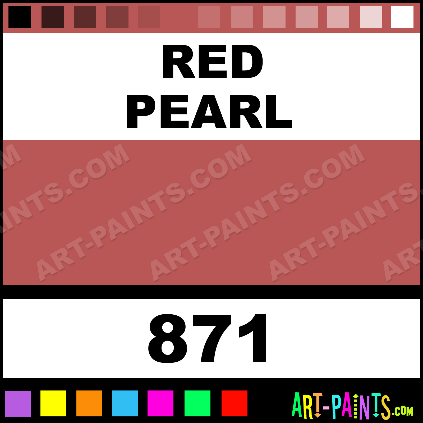 This beautiful Finest Artist Gouache shade is called Red Pearl, and comes from a company called Calligraphy. Their product number, along with the HTML color code, RGB, and CMYK codes are listed below. This Beautiful Shade of Red Pearl and others can be found in the Calligraphy Finest Artist Art Paint Gallery! Also be sure to browse through the other wonderful Professional Color Galleries to see more of Calligraphy Finest Artist Gouache Brand Paints and other Paint Manufacturers. And as always, Paint Paint Paint! -Art-Paints.com