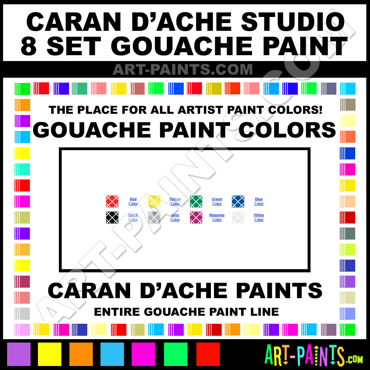 Caran Dache knows Gouache paints! They make a wonderful brand of paint called Caran Dache Studio 8 Set Gouache Colors that suits all types of artists. They strive to perfect the process of color and are one of the most popular Gouache Paint Brand companies in the world. Enjoy their entire paint brand collection from the list below. Caran Dache makes wonderful Artists Paints that everyone is sure to enjoy! Choose an Gouache Paint Color below to view that Hue and all their great related color paints. Paint on!     -Art-Paints.com