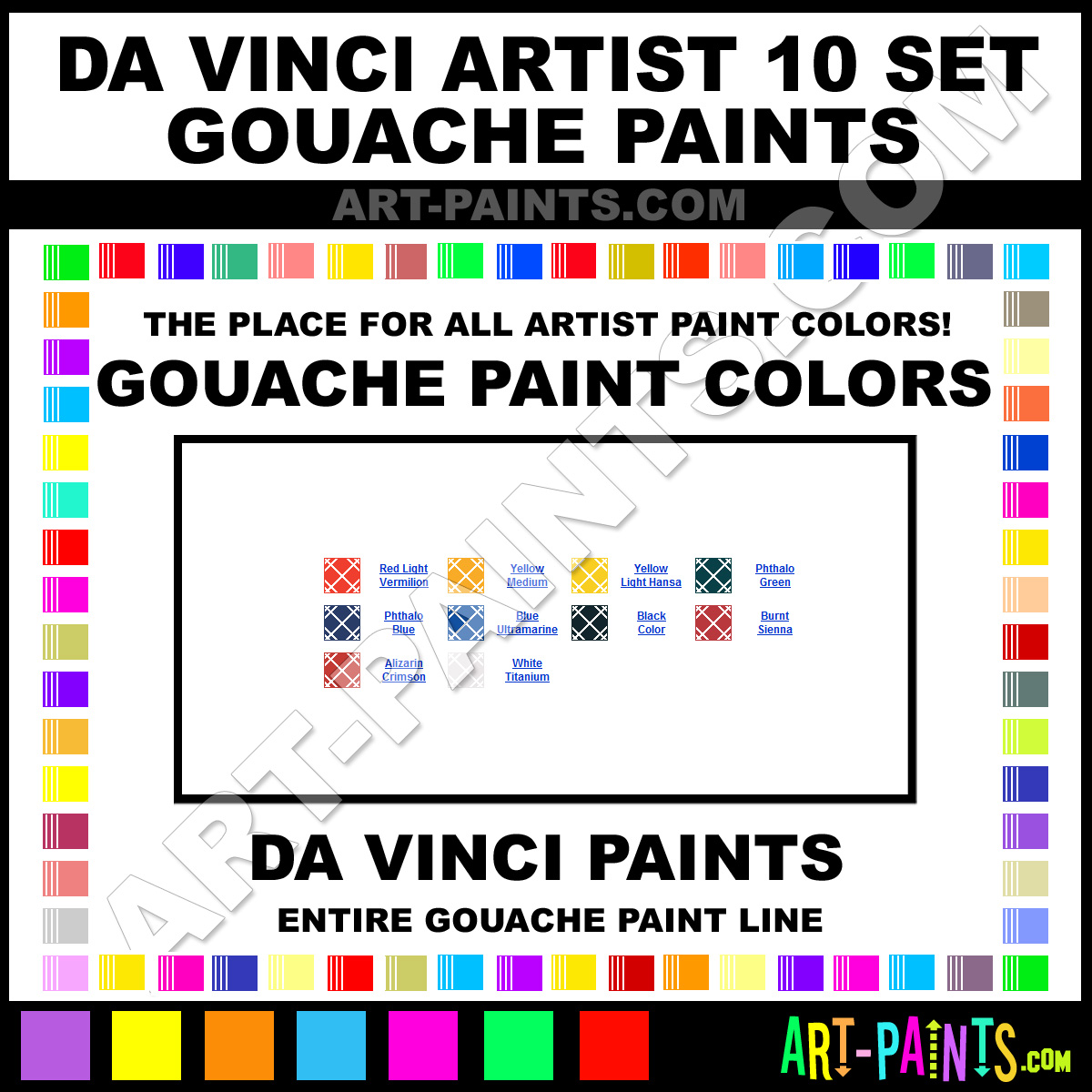 Da Vinci makes a beautiful Artist 10 Set Paint Brand. With a complete line of Gouache Color Paints, 10 colors in all, available in beautiful hues and colors, they will no doubt keep you painting and smiling at the same time. This brand is very unique and exquisite!