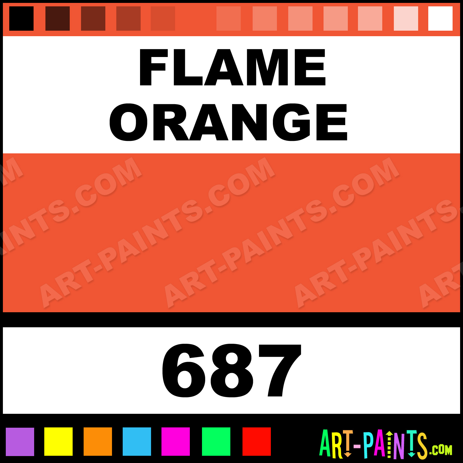 This beautiful Designer Gouache shade is called Flame Orange, and comes from a company called Daler Rowney. Their product number, along with the HTML color code, RGB, and CMYK codes are listed below. This Beautiful Shade of Flame Orange and others can be found in the Daler Rowney Designer Art Paint Gallery! Also be sure to browse through the other wonderful Professional Color Galleries to see more of Daler Rowney Designer Gouache Brand Paints and other Paint Manufacturers. And as always, Paint Paint Paint! -Art-Paints.com