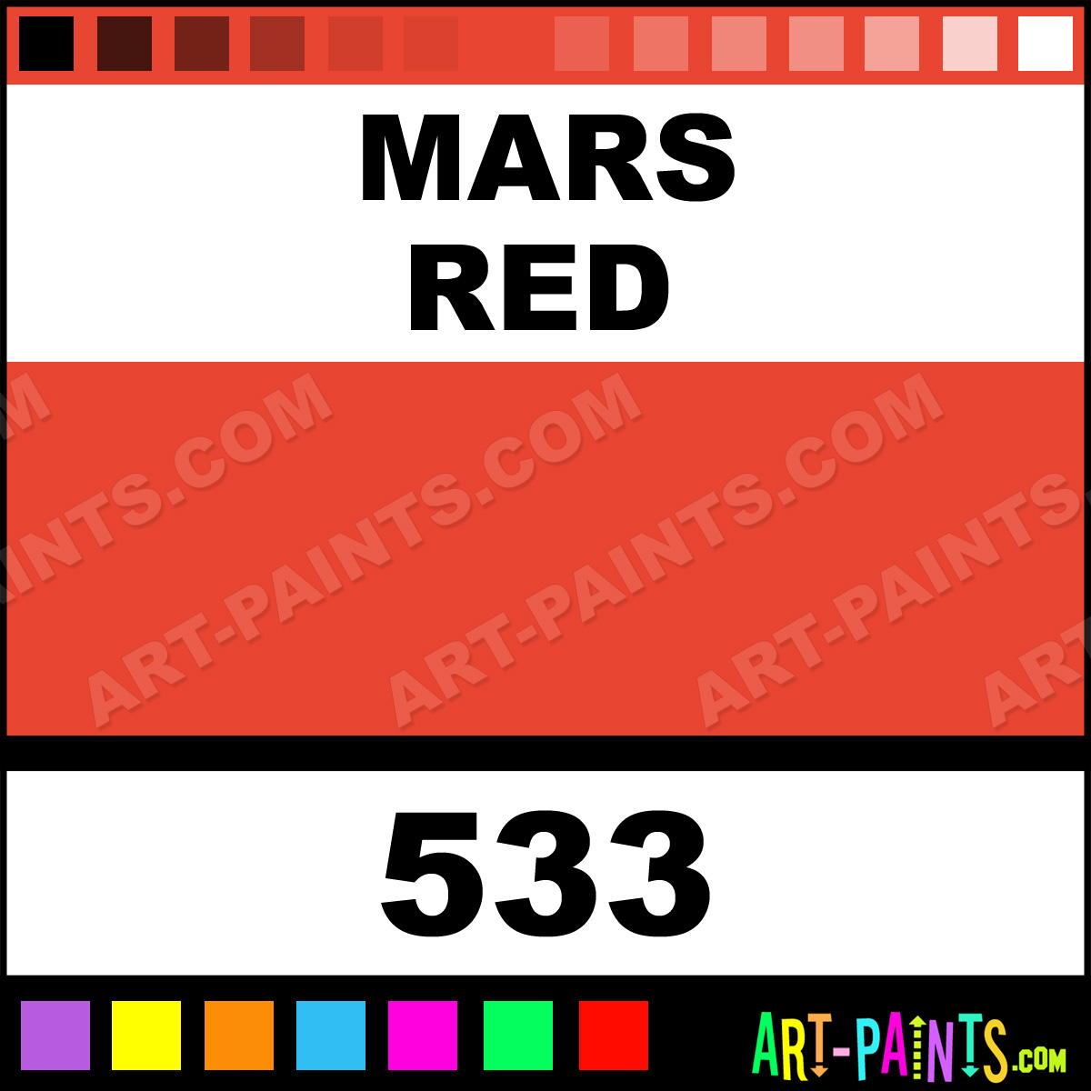 This beautiful Designer Gouache shade is called Mars Red, and comes from a company called Daler Rowney. Their product number, along with the HTML color code, RGB, and CMYK codes are listed below. This Beautiful Shade of Mars Red and others can be found in the Daler Rowney Designer Art Paint Gallery! Also be sure to browse through the other wonderful Professional Color Galleries to see more of Daler Rowney Designer Gouache Brand Paints and other Paint Manufacturers. And as always, Paint Paint Paint! -Art-Paints.com