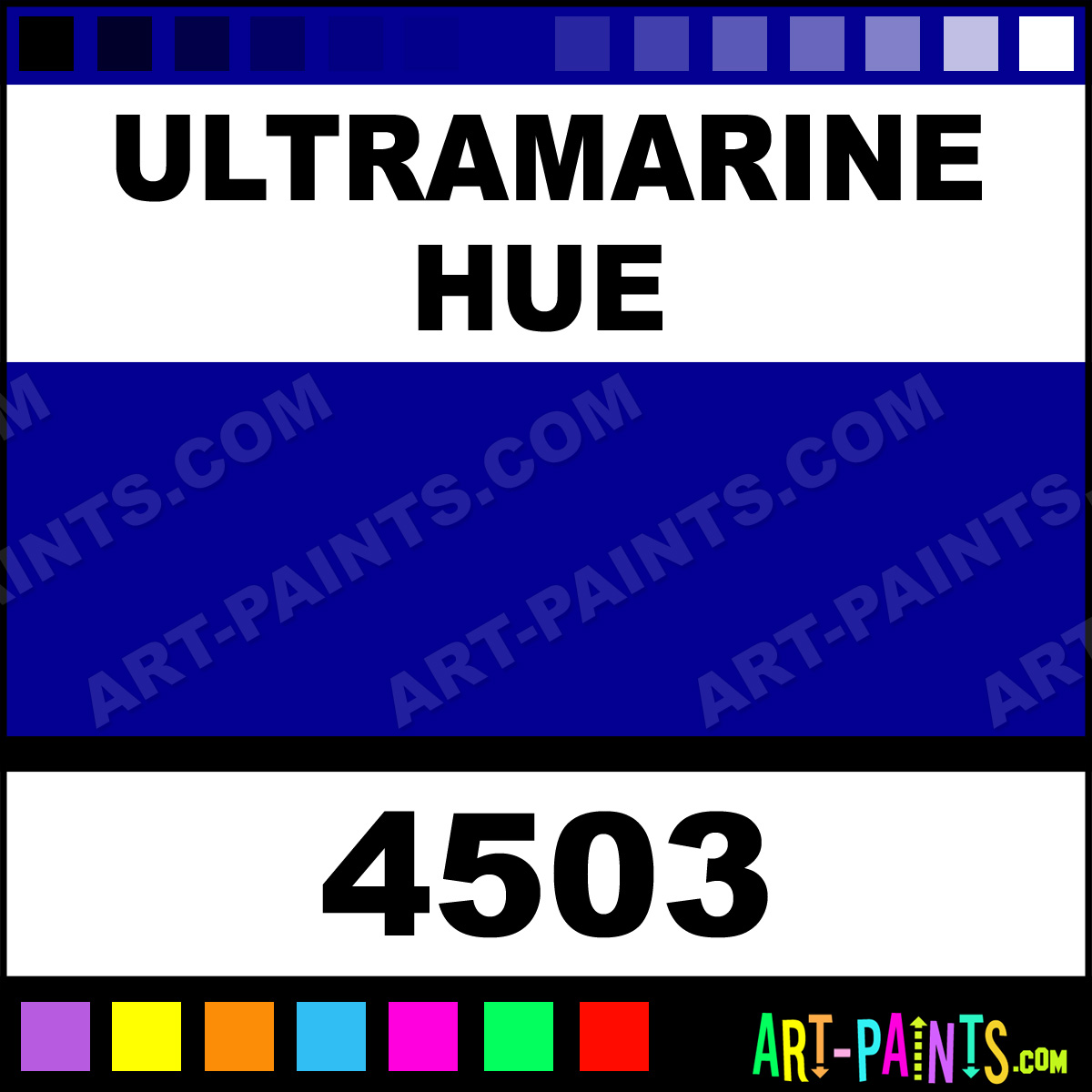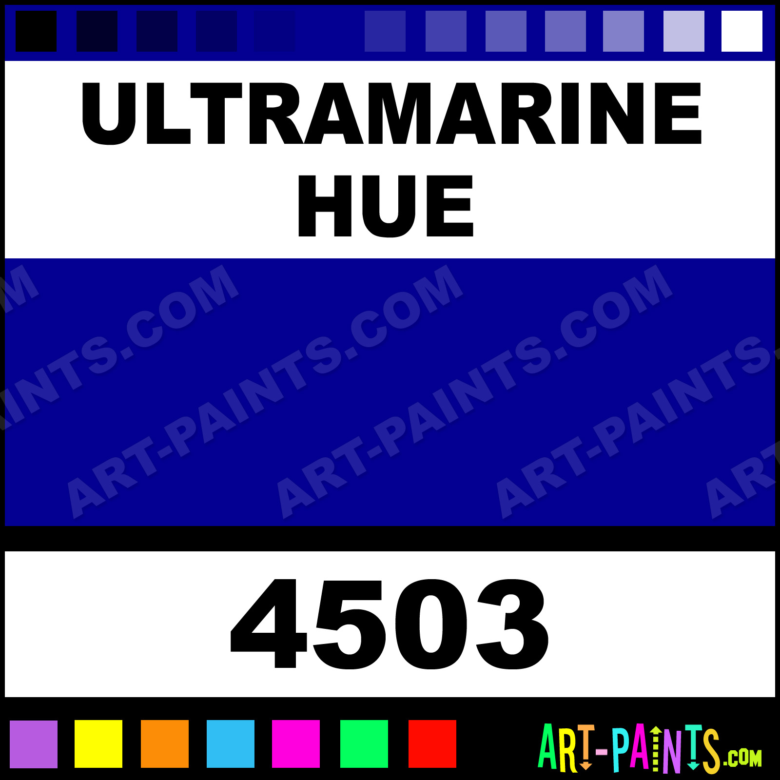 This beautiful Artist Gouache shade is called Ultramarine, and comes from a company called Giotto. Their product number, along with the HTML color code, RGB, and CMYK codes are listed below. This Beautiful Shade of Ultramarine and others can be found in the Giotto Artist Art Paint Gallery! Also be sure to browse through the other wonderful Professional Color Galleries to see more of Giotto Artist Gouache Brand Paints and other Paint Manufacturers. And as always, Paint Paint Paint! -Art-Paints.com