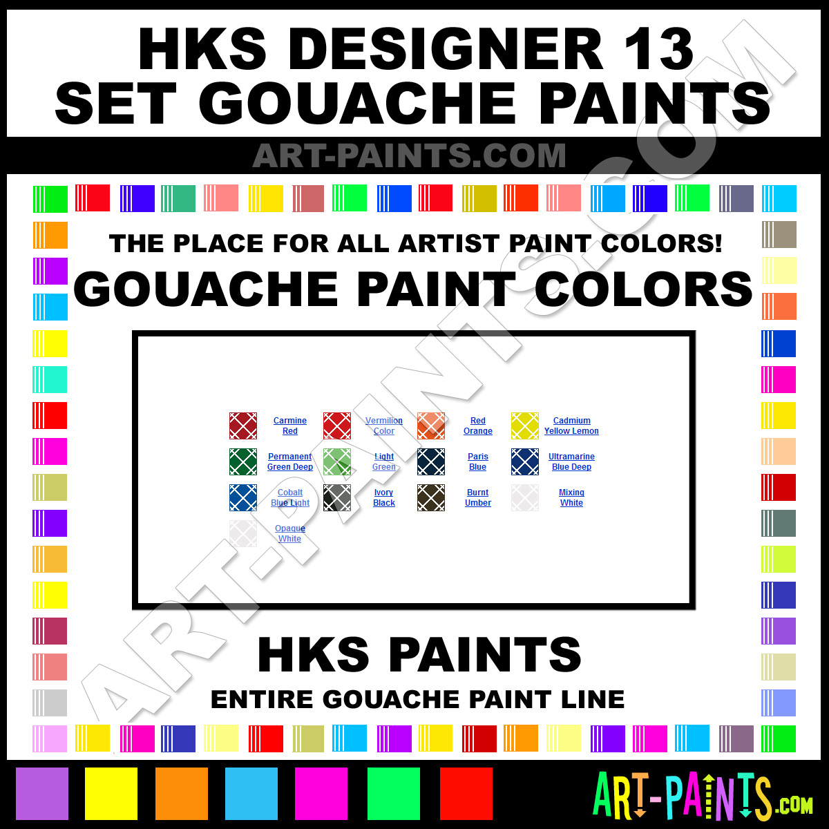 HKS knows Gouache paints! They make a wonderful brand of paint called HKS Designer 13 Set Gouache Colors that suits all types of artists. They strive to perfect the process of color and are one of the most popular Gouache Paint Brand companies in the world. Enjoy their entire paint brand collection from the list below. HKS makes wonderful Artists Paints that everyone is sure to enjoy! Choose an Gouache Paint Color below to view that Hue and all their great related color paints. Paint on!     -Art-Paints.com