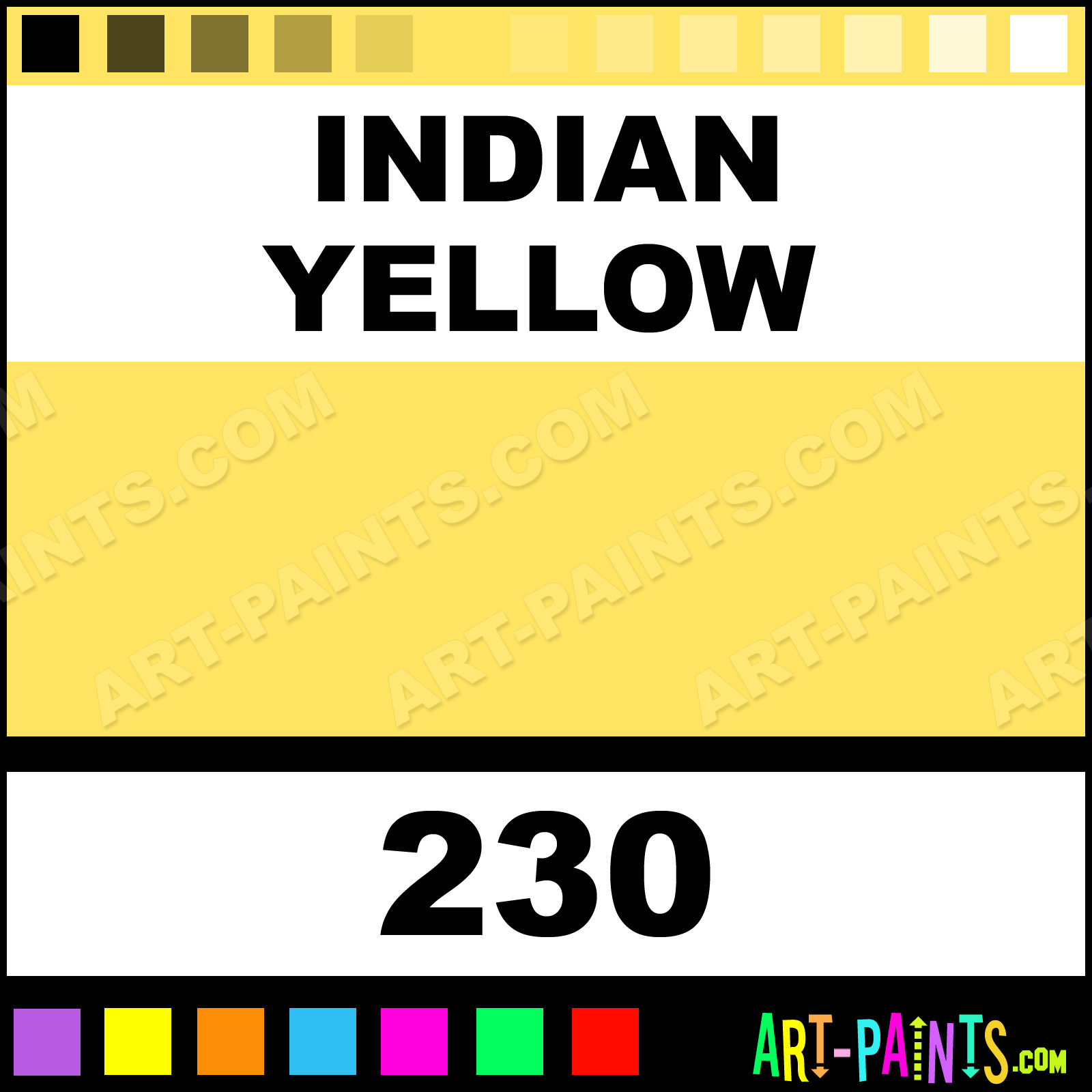This beautiful Series 12 Gouache shade is called Indian Yellow, and comes from a company called Horadam. Their product number, along with the HTML color code, RGB, and CMYK codes are listed below. This Beautiful Shade of Indian Yellow and others can be found in the Horadam Series 12 Art Paint Gallery! Also be sure to browse through the other wonderful Professional Color Galleries to see more of Horadam Series 12 Gouache Brand Paints and other Paint Manufacturers. And as always, Paint Paint Paint! -Art-Paints.com