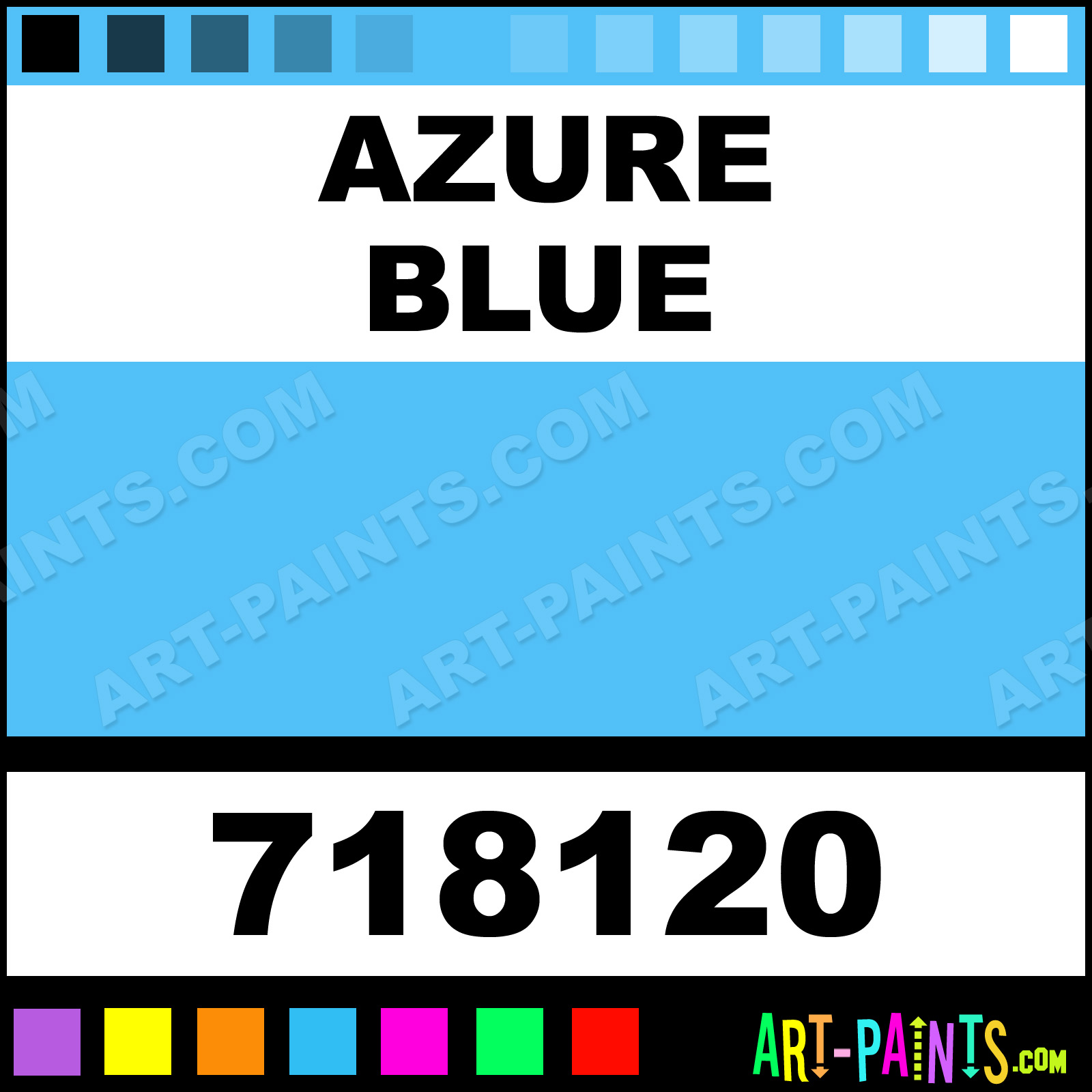 This beautiful Designer Gouache shade is called Azure Blue, and comes from a company called Lukas. Their product number, along with the HTML color code, RGB, and CMYK codes are listed below. This Beautiful Shade of Azure Blue and others can be found in the Lukas Designer Art Paint Gallery! Also be sure to browse through the other wonderful Professional Color Galleries to see more of Lukas Designer Gouache Brand Paints and other Paint Manufacturers. And as always, Paint Paint Paint! -Art-Paints.com