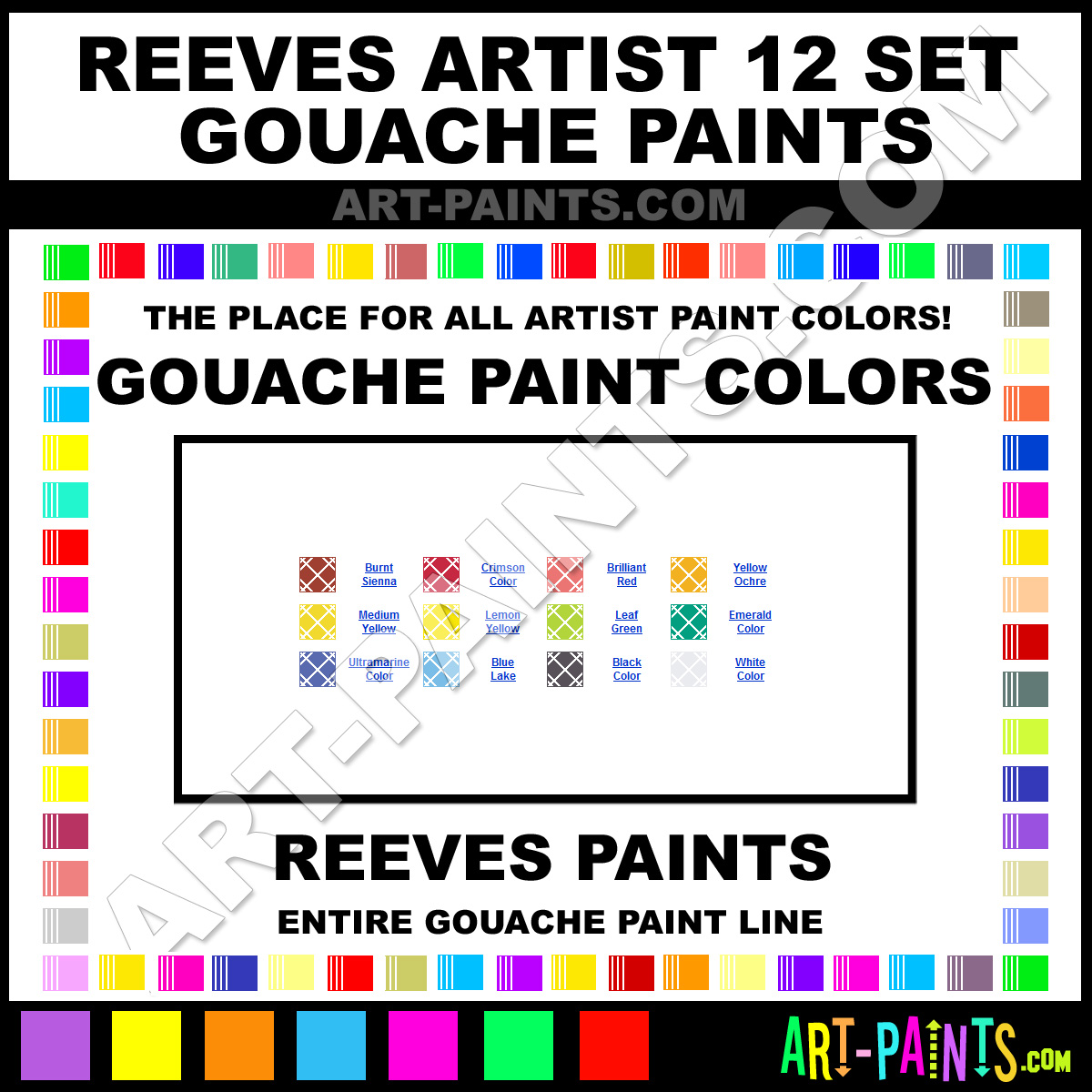 Reeves makes a beautiful Artist 12 Set Paint Brand. With a complete line of Gouache Color Paints, 12 colors in all, available in beautiful hues and colors, they will no doubt keep you painting and smiling at the same time. This brand is very unique and exquisite!