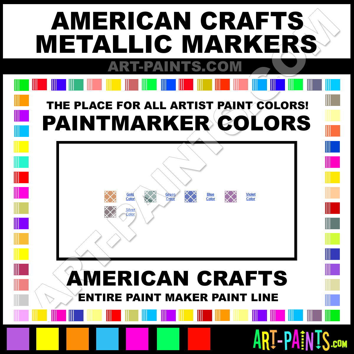 American Crafts knows Paintmarkers and Paintmarker Paints! They make a wonderful brand of paint called American Crafts Metallic Markers Paint Marker Colors and Marking Pens that suits all types of artists. They strive to perfect the process of color and are one of the most popular Paintmarker Brand companies in the world. Enjoy their entire paint brand collection from the list below. American Crafts makes wonderful Artists Paints that everyone is sure to enjoy! Choose an Paint Marker Paint Color below to view that Hue and all their great related color paints. Paint on!     -Art-Paints.com