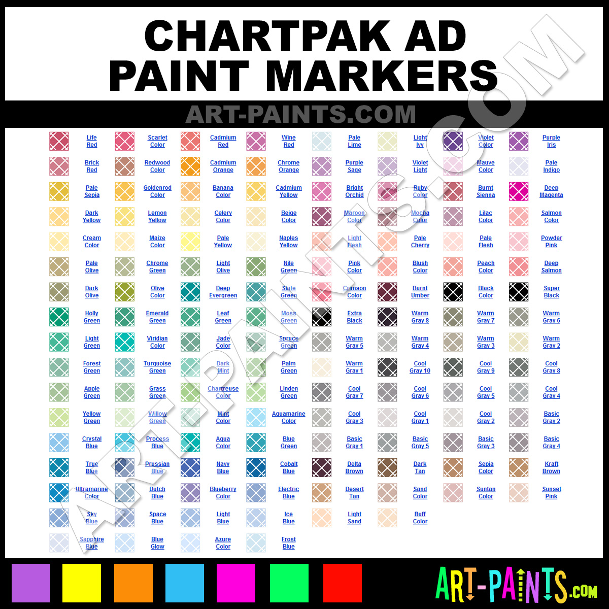 Chartpak knows Marker paints! They make a wonderful brand of paint called Chartpak Ad Markers Paint Marker's and Marking Pen Colors that suits all types of Paintmarker artists. They strive to perfect the process of color and are one of the most popular Paint Marker Brand companies in the world. Enjoy their entire paint brand collection from the list below. Chartpak makes wonderful Artists Paints that everyone is sure to enjoy! Choose a Paint Marker Paint Color below to view that Hue and all their great related color Paintmarker Paints.     -Art-Paints.com