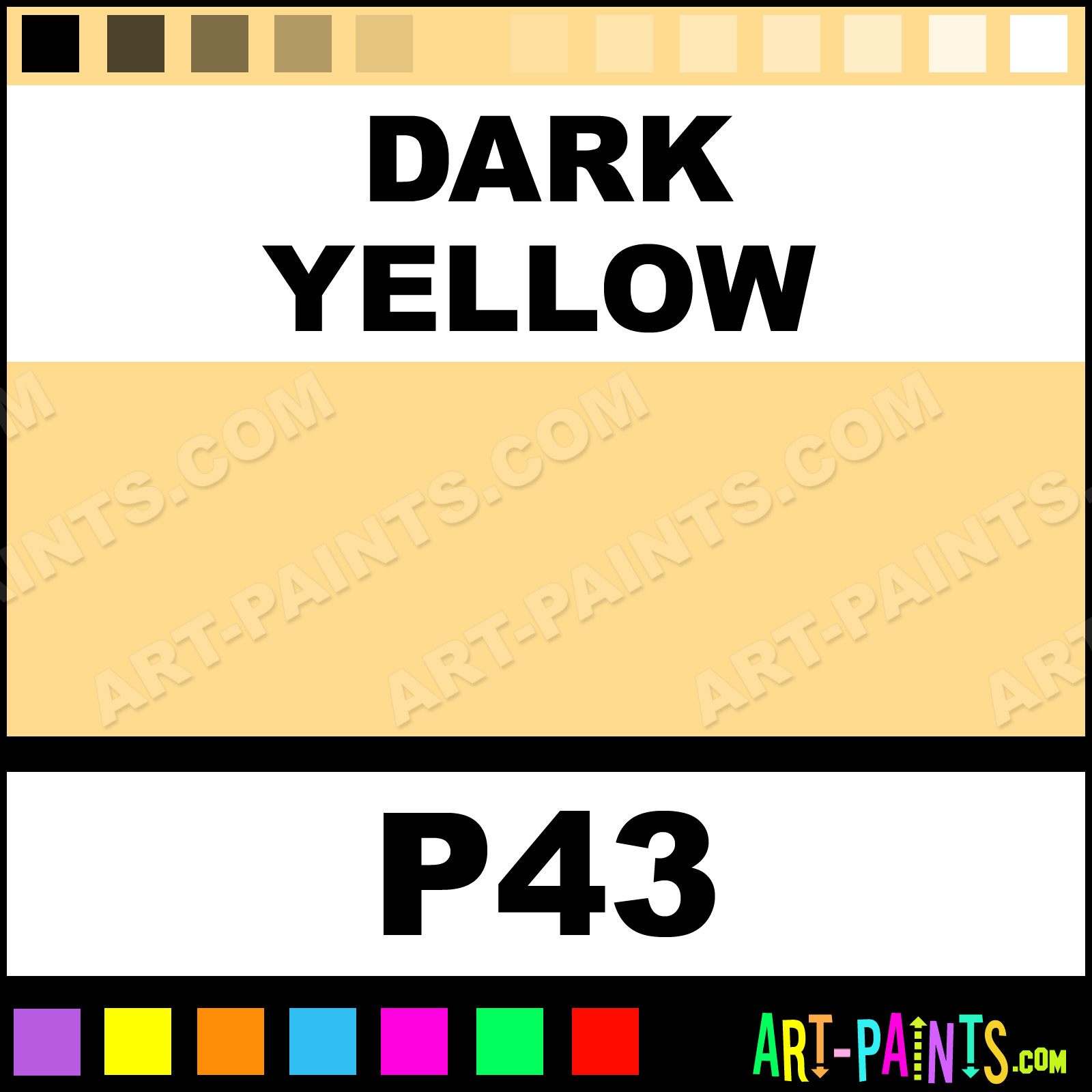 This beautiful Ad Markers Paint Marker shade is called Dark Yellow, and comes from a company called Chartpak. Their Paintmarker product number, along with the HTML color code, RGB, and CMYK codes are listed below. This Beautiful Shade of Dark Yellow and other Marking Pens can be found in the Chartpak Ad Markers Art Paint Gallery! Also be sure to browse through the other wonderful Professional Marking Pen Color Galleries to see more of Chartpak Ad Markers Paintmarker Brand Paints and other Paint Marker Manufacturers. And as always, Paint Paint Paint!  -Art-Paints.com