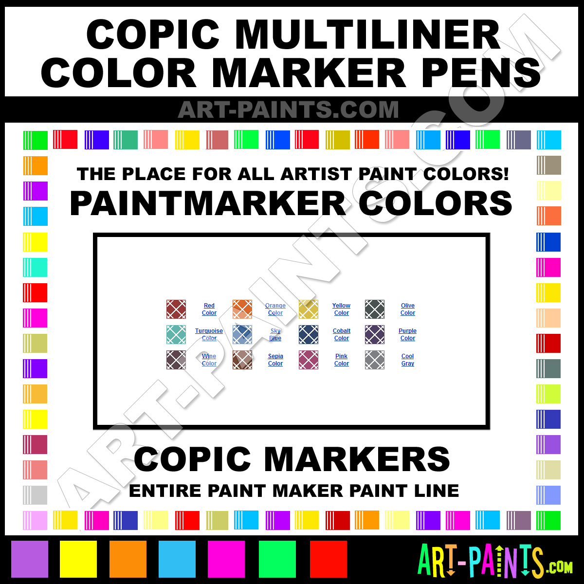 Copic knows Paintmarkers and Paintmarker Paints! They make a wonderful brand of paint called Copic Multiliner Color Pens Paint Marker Colors and Marking Pens that suits all types of artists. They strive to perfect the process of color and are one of the most popular Paintmarker Brand companies in the world. Enjoy their entire paint brand collection from the list below. Copic makes wonderful Artists Paints that everyone is sure to enjoy! Choose an Paint Marker Paint Color below to view that Hue and all their great related paints.     -Art-Paints.com