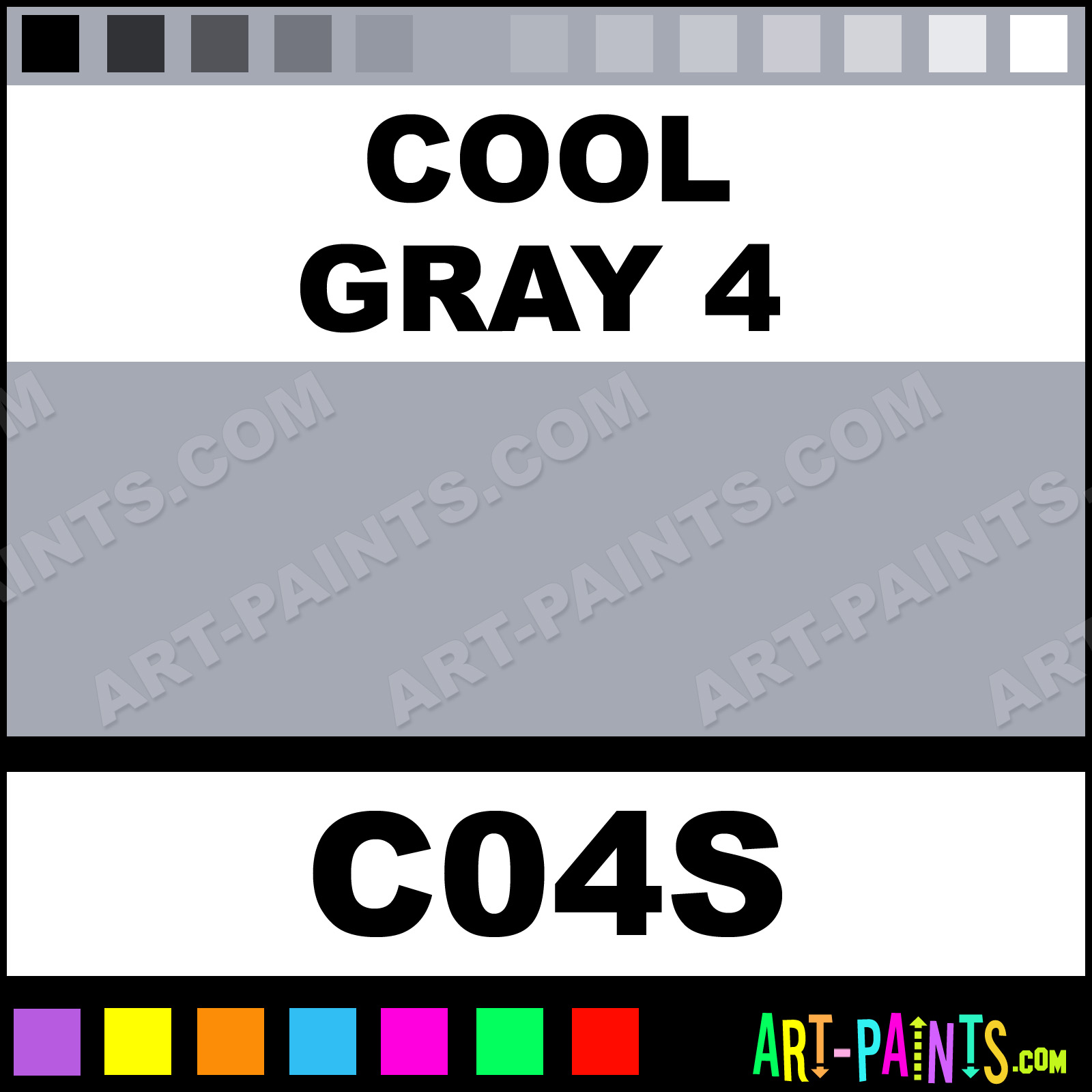 This beautiful Sketch Markers Paint Marker shade is called Cool Gray 4, and comes from a company called Copic. Their product number, along with the HTML color code, RGB, and CMYK codes are listed below. This Beautiful Shade of Cool Gray 4 and other Paintmarkers can be found in the Copic Sketch Markers Art Paint Marking Pen Gallery! Also be sure to browse through the other wonderful Paintmarker Professional Color Galleries to see more of Copic Sketch Markers Paint Marker Brand Paints and other Marking Pen Paint Manufacturers. And as always, Paint Paint Paint!  -Art-Paints.com