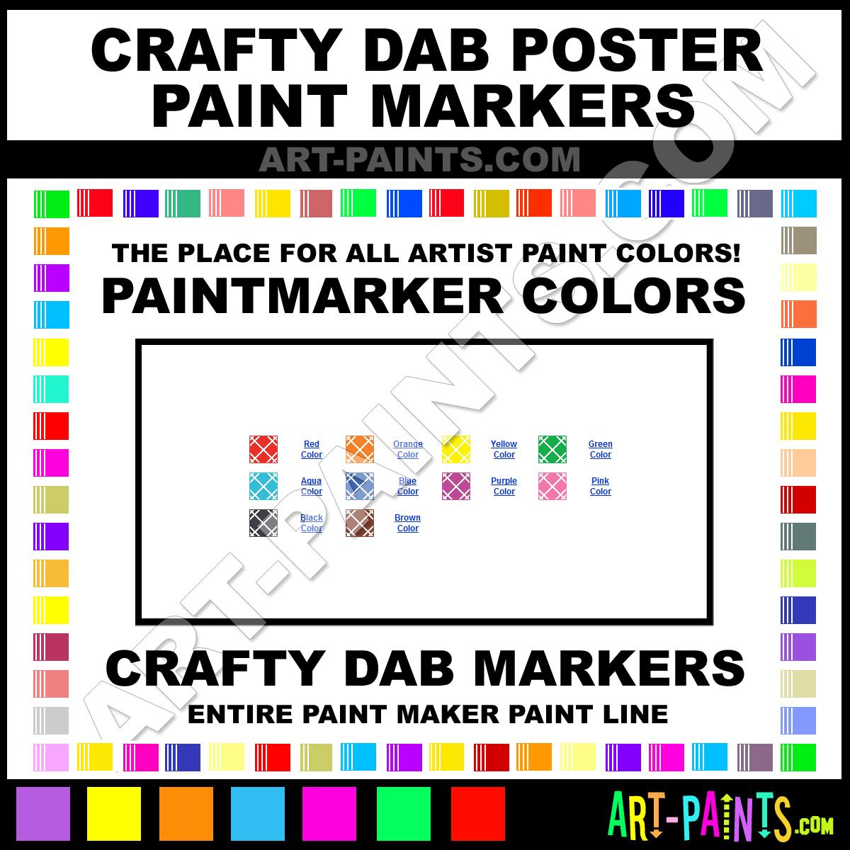 Crafty Dab knows Paintmarkers and Paintmarker Paints! They make a wonderful brand of paint called Crafty Dab Poster Colors Paint Marker Colors and Marking Pens that suits all types of artists. They strive to perfect the process of color and are one of the most popular Paintmarker Brand companies in the world. Enjoy their entire paint brand collection from the list below. Crafty Dab makes wonderful Artists Paints that everyone is sure to enjoy! Choose an Paint Marker Paint Color below to view that Hue and all their great related color paints. Paint on!     -Art-Paints.com