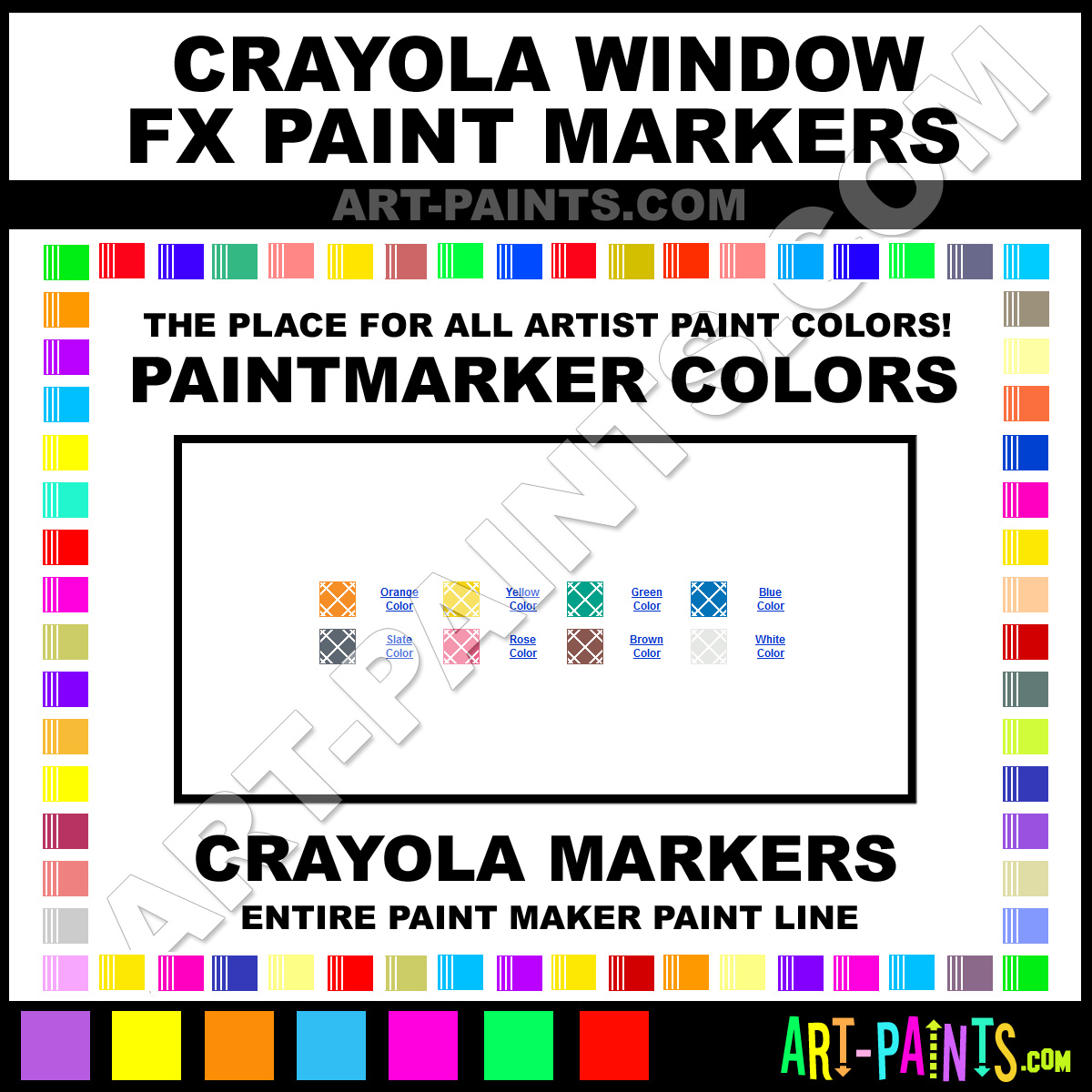 Crayola knows Paintmarkers and Paintmarker Paints! They make a wonderful brand of paint called Crayola Window FX Paint Marker Colors and Marking Pens that suits all types of artists. They strive to perfect the process of color and are one of the most popular Paintmarker Brand companies in the world. Enjoy their entire paint brand collection from the list below. Crayola makes wonderful Artists Paints that everyone is sure to enjoy! Choose an Paint Marker Paint Color below to view that Hue and all their great related paints.     -Art-Paints.com
