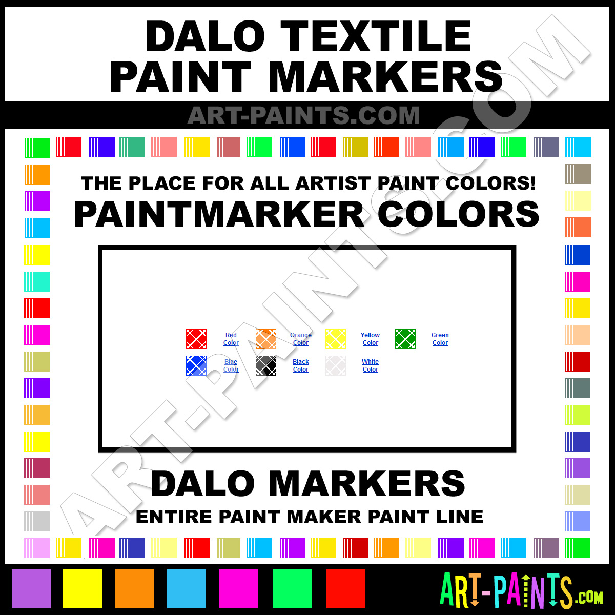 Dalo knows Paintmarkers and Paintmarker Paints! They make a wonderful brand of paint called Dalo Textile Marker Paint Marker Colors and Marking Pens that suits all types of artists. They strive to perfect the process of color and are one of the most popular Paintmarker Brand companies in the world. Enjoy their entire paint brand collection from the list below. Dalo makes wonderful Artists Paints that everyone is sure to enjoy! Choose an Paint Marker Paint Color below to view that Hue and all their great related color paints. Paint on!     -Art-Paints.com