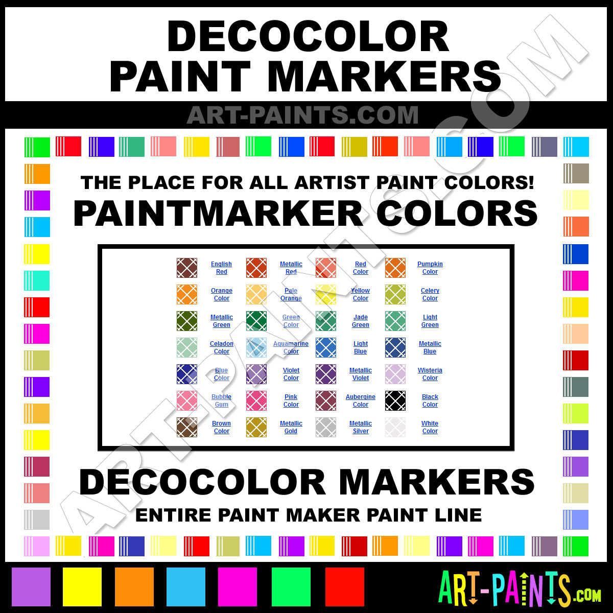 DecoColor knows Paintmarker Paints and Marking Pens! They make wonderful brands of paint for all types of artists. They strive to perfect the process of color and are one of the most popular Paint Marker Brand companies in the world. Enjoy their entire brand collection from the list below. DecoColor makes a couple different types of Paintmarker Paint Brands and Marking Pens including its Acrylic Paint Markers and its Marvy Paint Markers! Choose an Paint Marker Paint type below to view that brand and all the related Color Paints and Hues in it. Paint on!   -Art-Paints.com