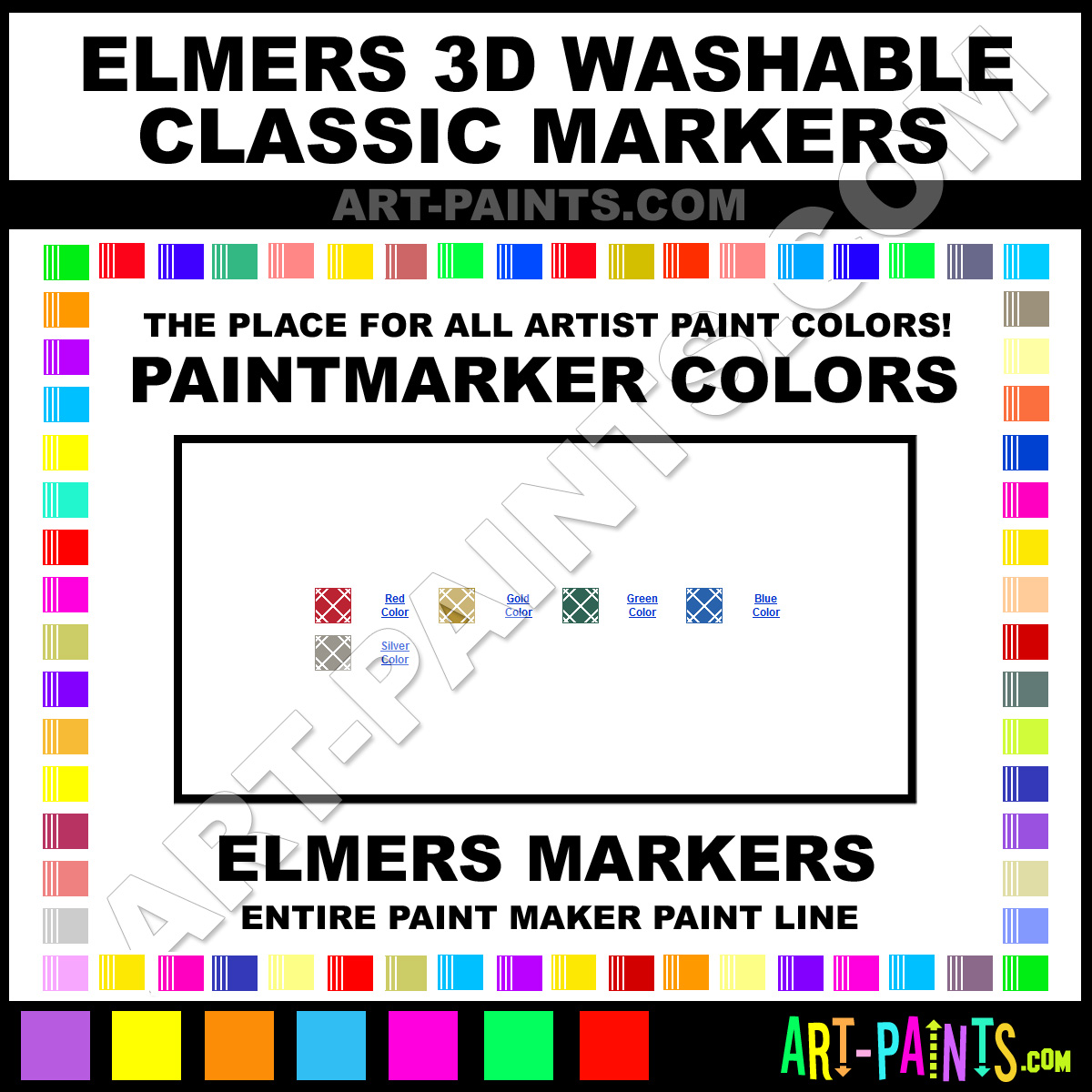 Elmers knows Paintmarkers and Paintmarker Paints! They make a wonderful brand of paint called Elmers 3D Washable Classic Paint Marker Colors and Marking Pens that suits all types of artists. They strive to perfect the process of color and are one of the most popular Paintmarker Brand companies in the world. Enjoy their entire paint brand collection from the list below. Elmers makes wonderful Artists Paints that everyone is sure to enjoy! Choose an Paint Marker Paint Color below to view that Hue and all their related paints.     -Art-Paints.com