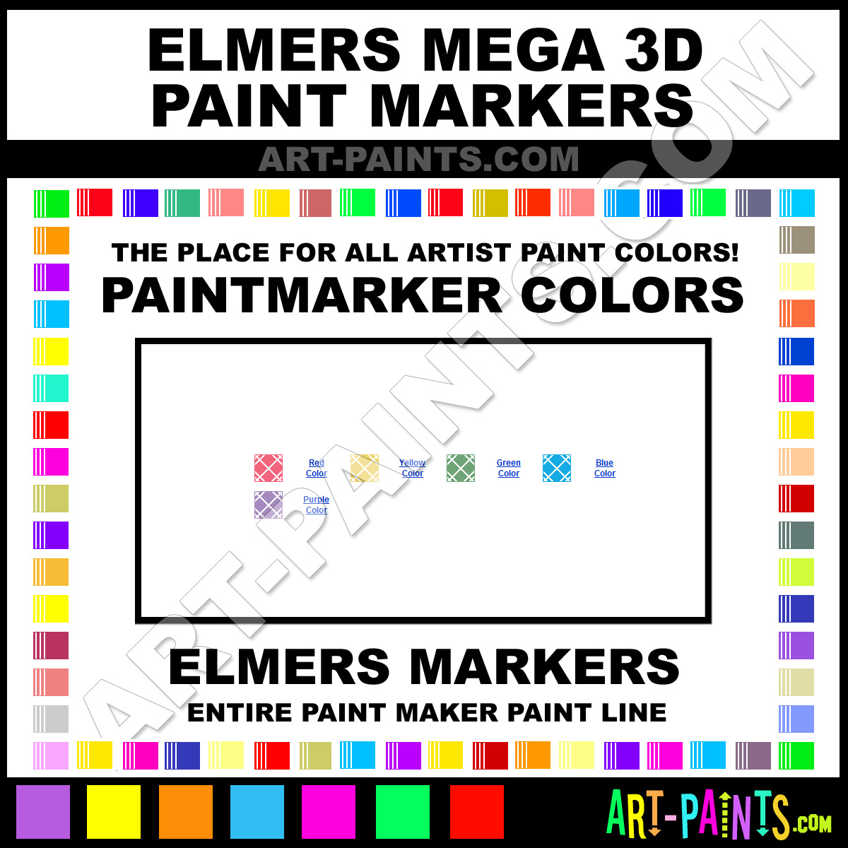 Elmers knows Paintmarkers and Paintmarker Paints! They make a wonderful brand of paint called Elmers Mega 3-D Paint Marker Colors and Marking Pens that suits all types of artists. They strive to perfect the process of color and are one of the most popular Paintmarker Brand companies in the world. Enjoy their entire paint brand collection from the list below. Elmers makes wonderful Artists Paints that everyone is sure to enjoy! Choose an Paint Marker Paint Color below to view that Hue and all their great related color paints. Paint on!     -Art-Paints.com