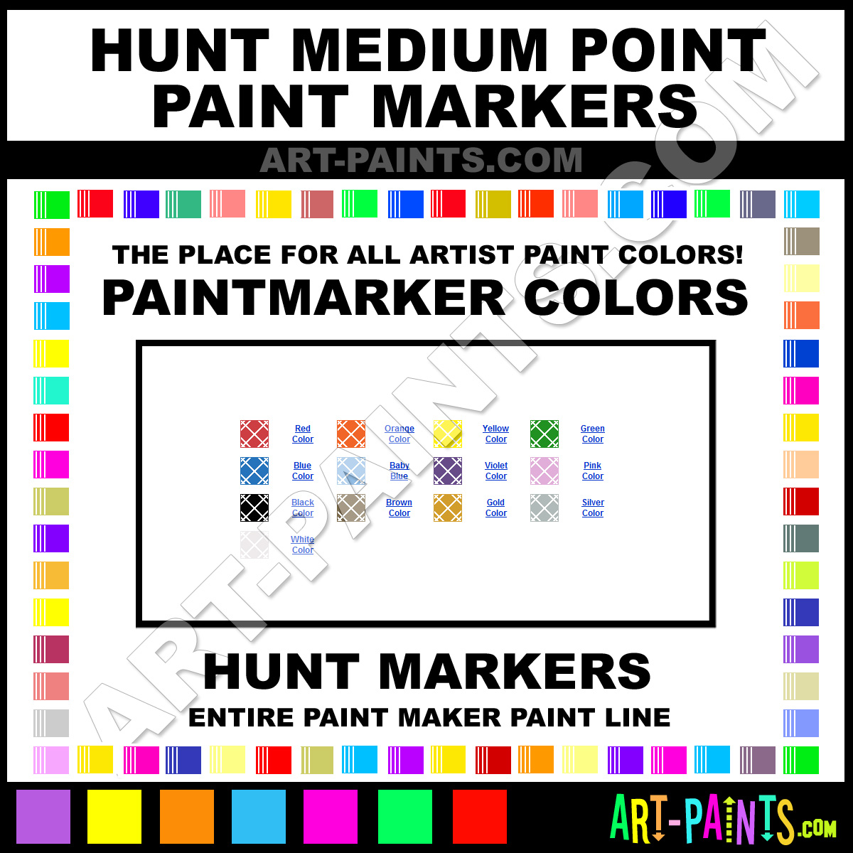 Hunt knows Paintmarkers and Paintmarker Paints! They make a wonderful brand of paint called Hunt Medium Point Paint Marker Colors and Marking Pens that suits all types of artists. They strive to perfect the process of color and are one of the most popular Paintmarker Brand companies in the world. Enjoy their entire paint brand collection from the list below. Hunt makes wonderful Artists Paints that everyone is sure to enjoy! Choose an Paint Marker Paint Color below to view that Hue and all their great related color paints. Paint on!     -Art-Paints.com