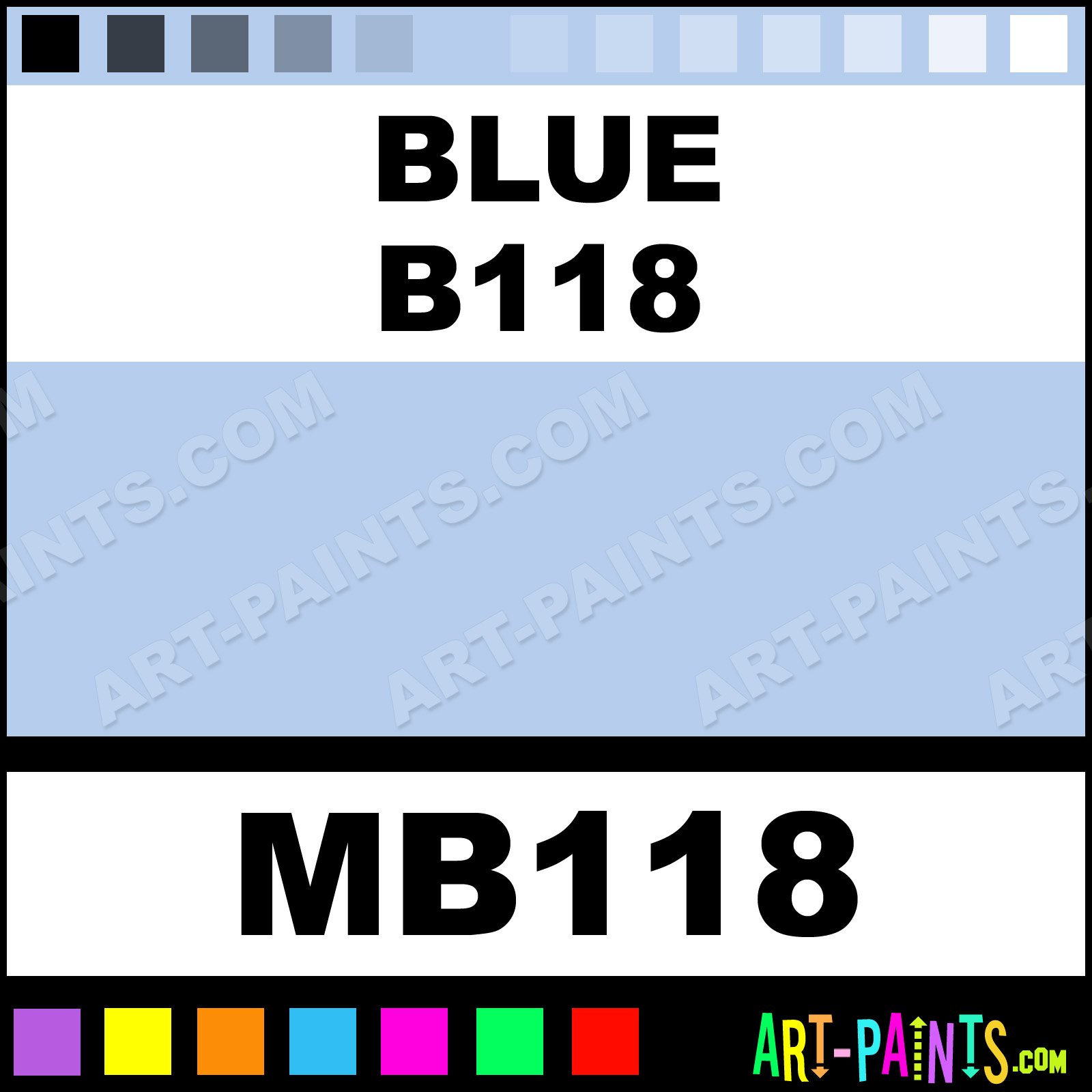 This beautiful Tria Pens Paint Marker shade is called Blue B118, and comes from a company called Letraset. Their product number, along with the HTML color code, RGB, and CMYK codes are listed below. This Beautiful Shade of Blue B118 and other Paintmarkers can be found in the Letraset Tria Pens Art Paint Marking Pen Gallery! Also be sure to browse through the other wonderful Paintmarker Professional Color Galleries to see more of Letraset Tria Pens Paint Marker Brand Paints and other Marking Pen Paint Manufacturers. And as always, Paint Paint Paint!  -Art-Paints.com