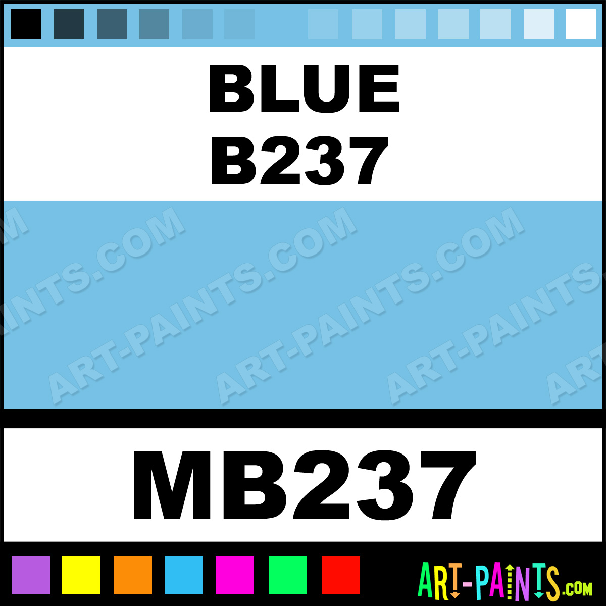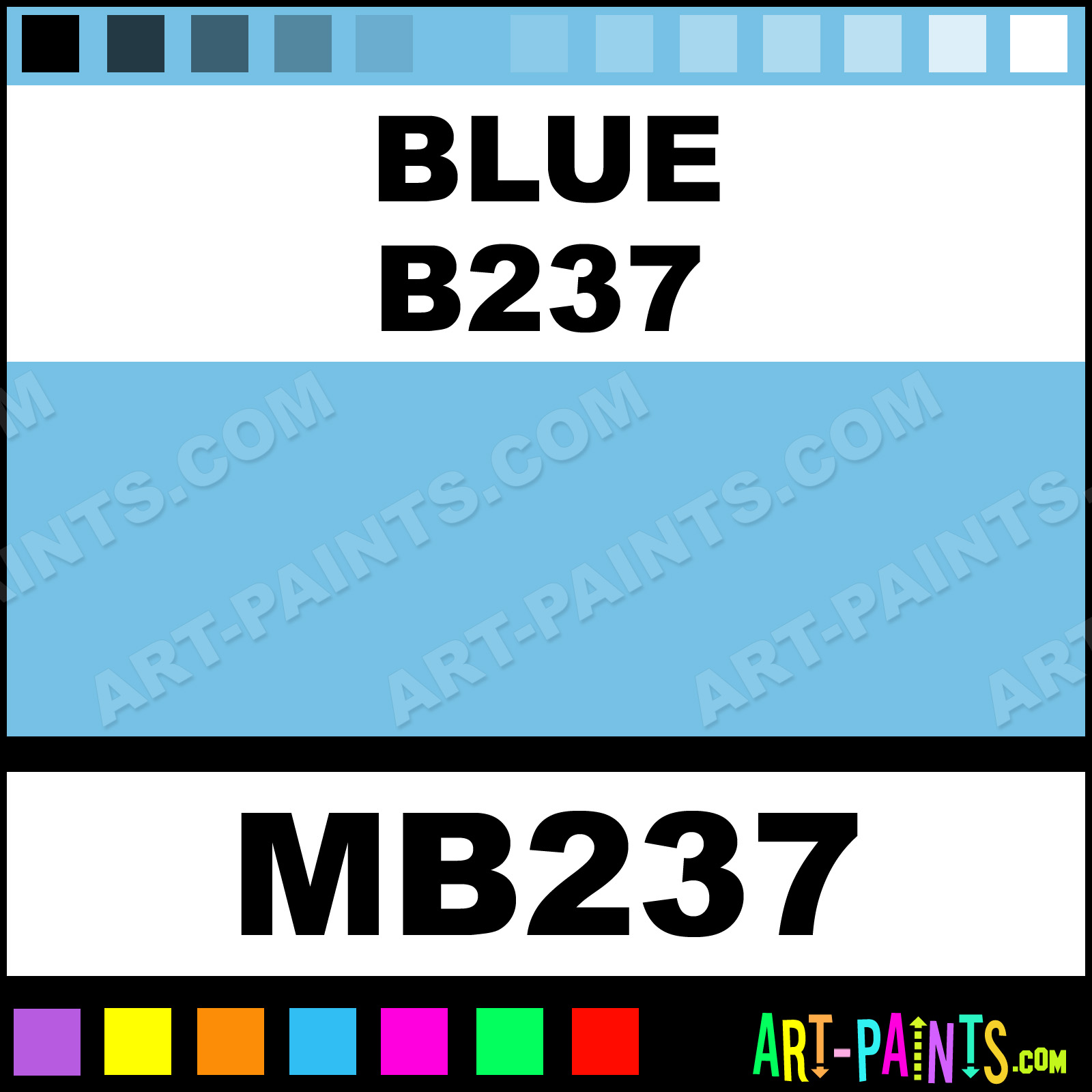 This beautiful Tria Pens Paint Marker shade is called Blue B237, and comes from a company called Letraset. Their product number, along with the HTML color code, RGB, and CMYK codes are listed below. This Beautiful Shade of Blue B237 and other Paintmarkers can be found in the Letraset Tria Pens Art Paint Marking Pen Gallery! Also be sure to browse through the other wonderful Paintmarker Professional Color Galleries to see more of Letraset Tria Pens Paint Marker Brand Paints and other Marking Pen Paint Manufacturers. And as always, Paint Paint Paint!  -Art-Paints.com