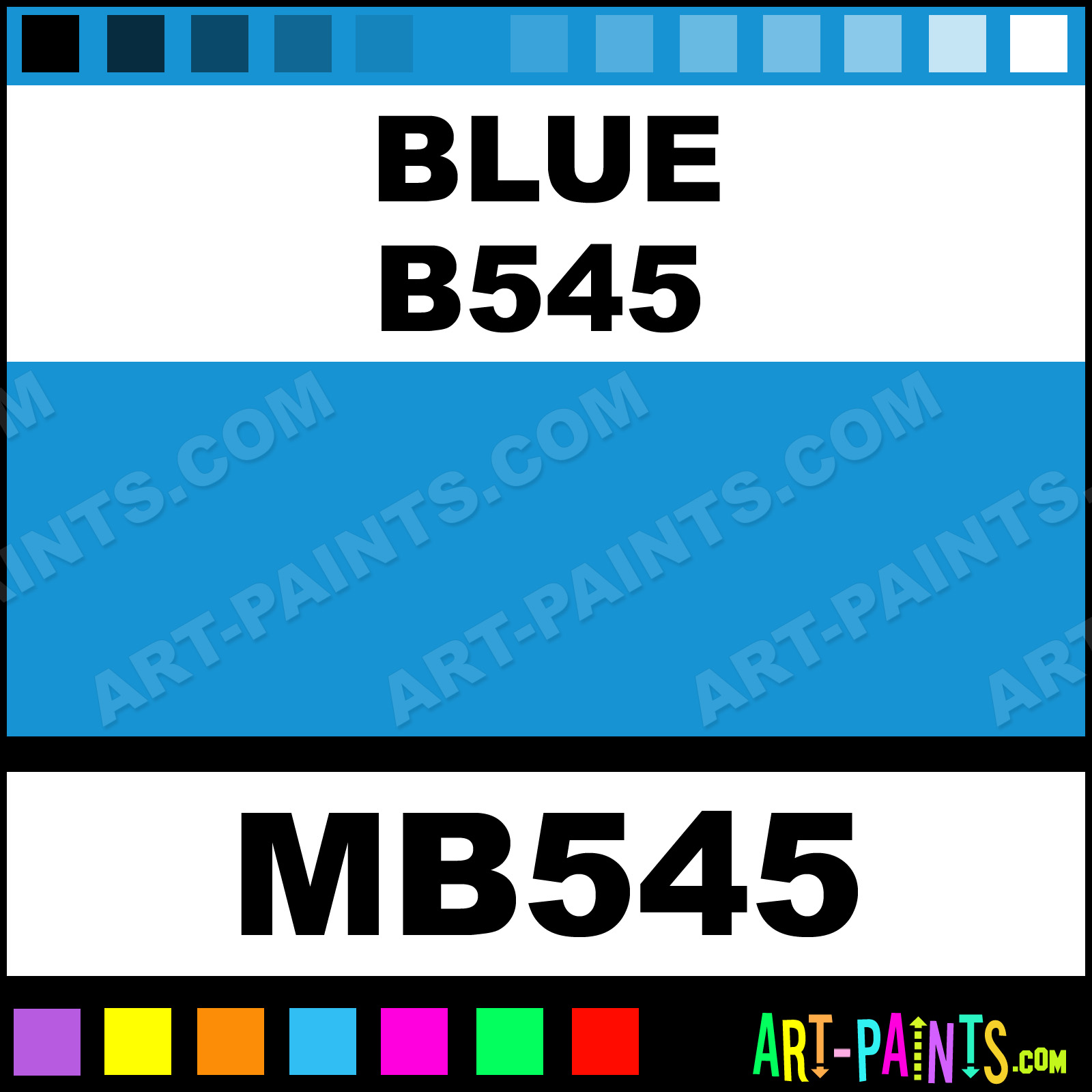 This beautiful Tria Pens Paint Marker shade is called Blue B545, and comes from a company called Letraset. Their product number, along with the HTML color code, RGB, and CMYK codes are listed below. This Beautiful Shade of Blue B545 and other Paintmarkers can be found in the Letraset Tria Pens Art Paint Marking Pen Gallery! Also be sure to browse through the other wonderful Paintmarker Professional Color Galleries to see more of Letraset Tria Pens Paint Marker Brand Paints and other Marking Pen Paint Manufacturers. And as always, Paint Paint Paint!  -Art-Paints.com