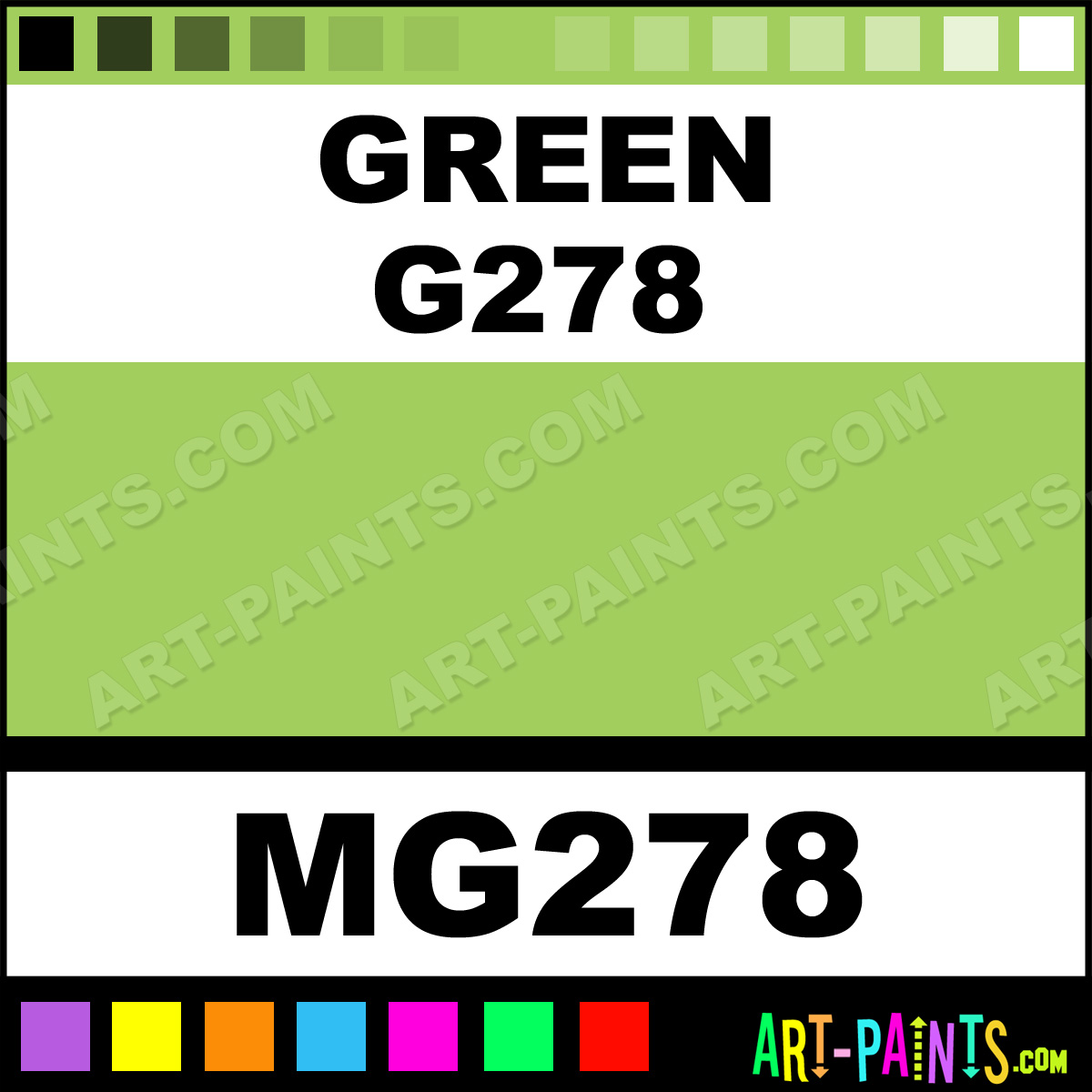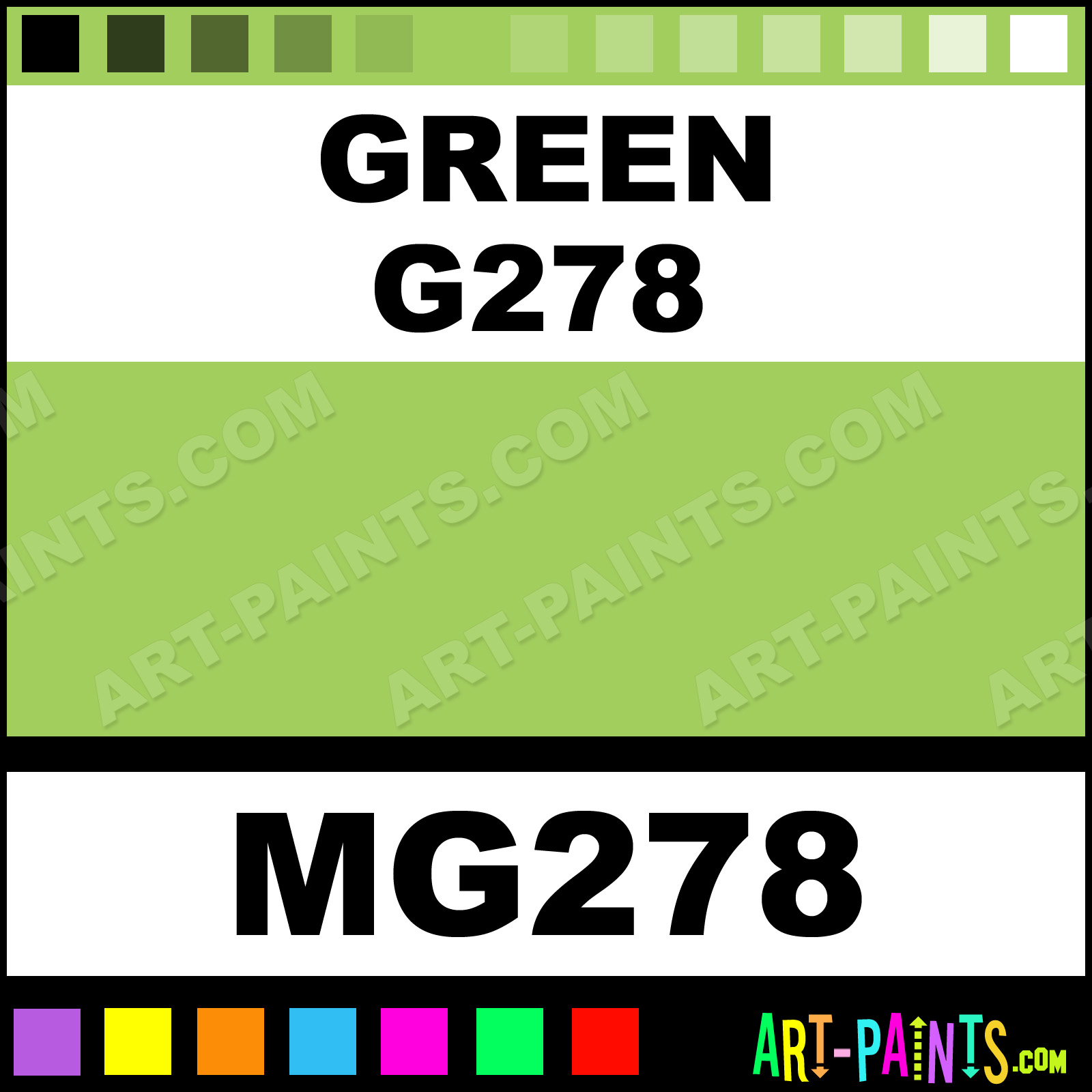 This beautiful Tria Pens Paint Marker shade is called Green G278, and comes from a company called Letraset. Their product number, along with the HTML color code, RGB, and CMYK codes are listed below. This Beautiful Shade of Green G278 and other Paintmarkers can be found in the Letraset Tria Pens Art Paint Marking Pen Gallery! Also be sure to browse through the other wonderful Paintmarker Professional Color Galleries to see more of Letraset Tria Pens Paint Marker Brand Paints and other Marking Pen Paint Manufacturers. And as always, Paint Paint Paint!  -Art-Paints.com