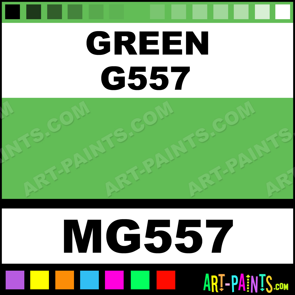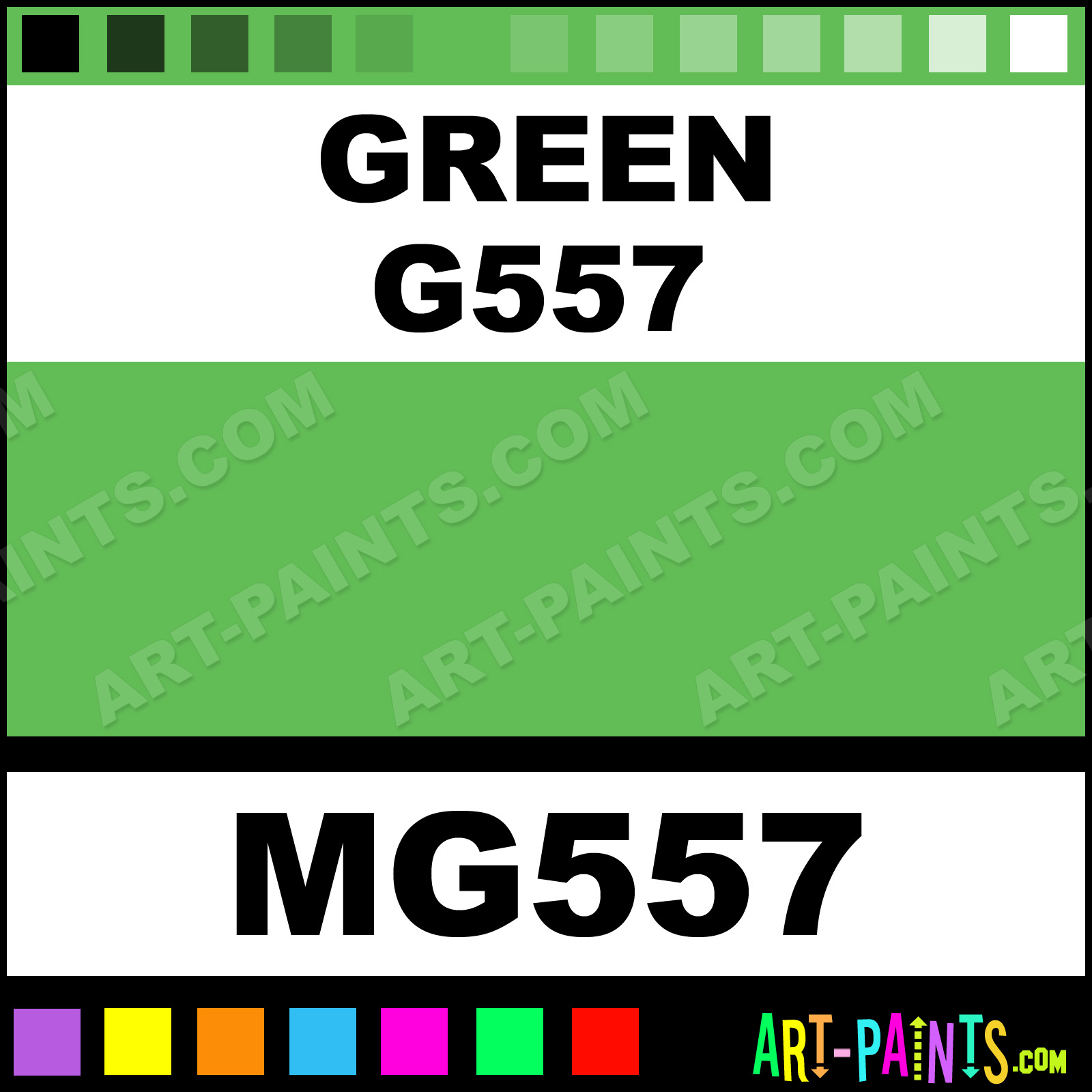 This beautiful Tria Pens Paint Marker shade is called Green G557, and comes from a company called Letraset. Their product number, along with the HTML color code, RGB, and CMYK codes are listed below. This Beautiful Shade of Green G557 and other Paintmarkers can be found in the Letraset Tria Pens Art Paint Marking Pen Gallery! Also be sure to browse through the other wonderful Paintmarker Professional Color Galleries to see more of Letraset Tria Pens Paint Marker Brand Paints and other Marking Pen Paint Manufacturers. And as always, Paint Paint Paint!  -Art-Paints.com