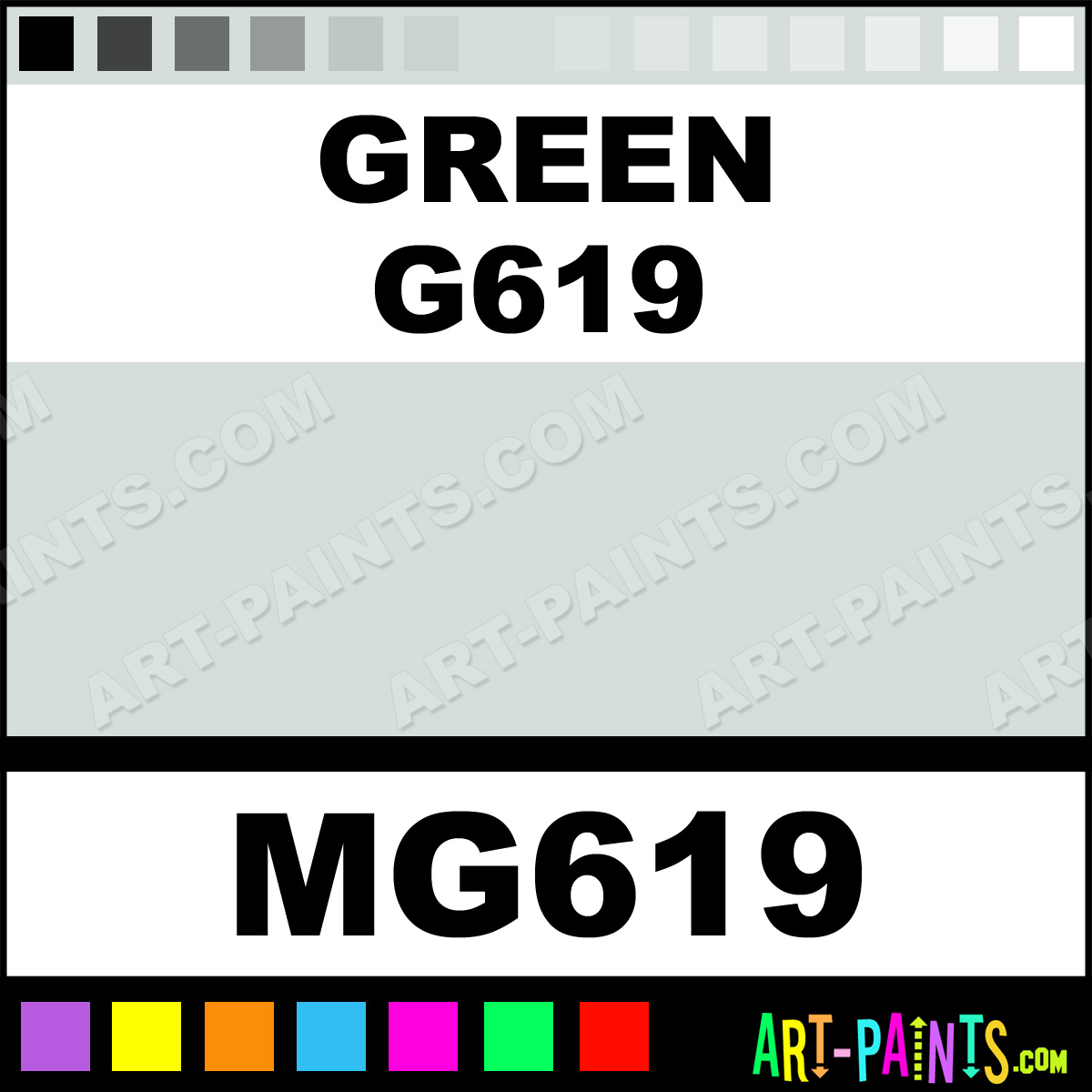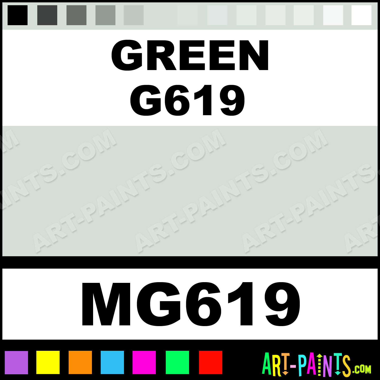 This beautiful Tria Pens Paint Marker shade is called Green G619, and comes from a company called Letraset. Their product number, along with the HTML color code, RGB, and CMYK codes are listed below. This Beautiful Shade of Green G619 and other Paintmarkers can be found in the Letraset Tria Pens Art Paint Marking Pen Gallery! Also be sure to browse through the other wonderful Paintmarker Professional Color Galleries to see more of Letraset Tria Pens Paint Marker Brand Paints and other Marking Pen Paint Manufacturers. And as always, Paint Paint Paint!  -Art-Paints.com